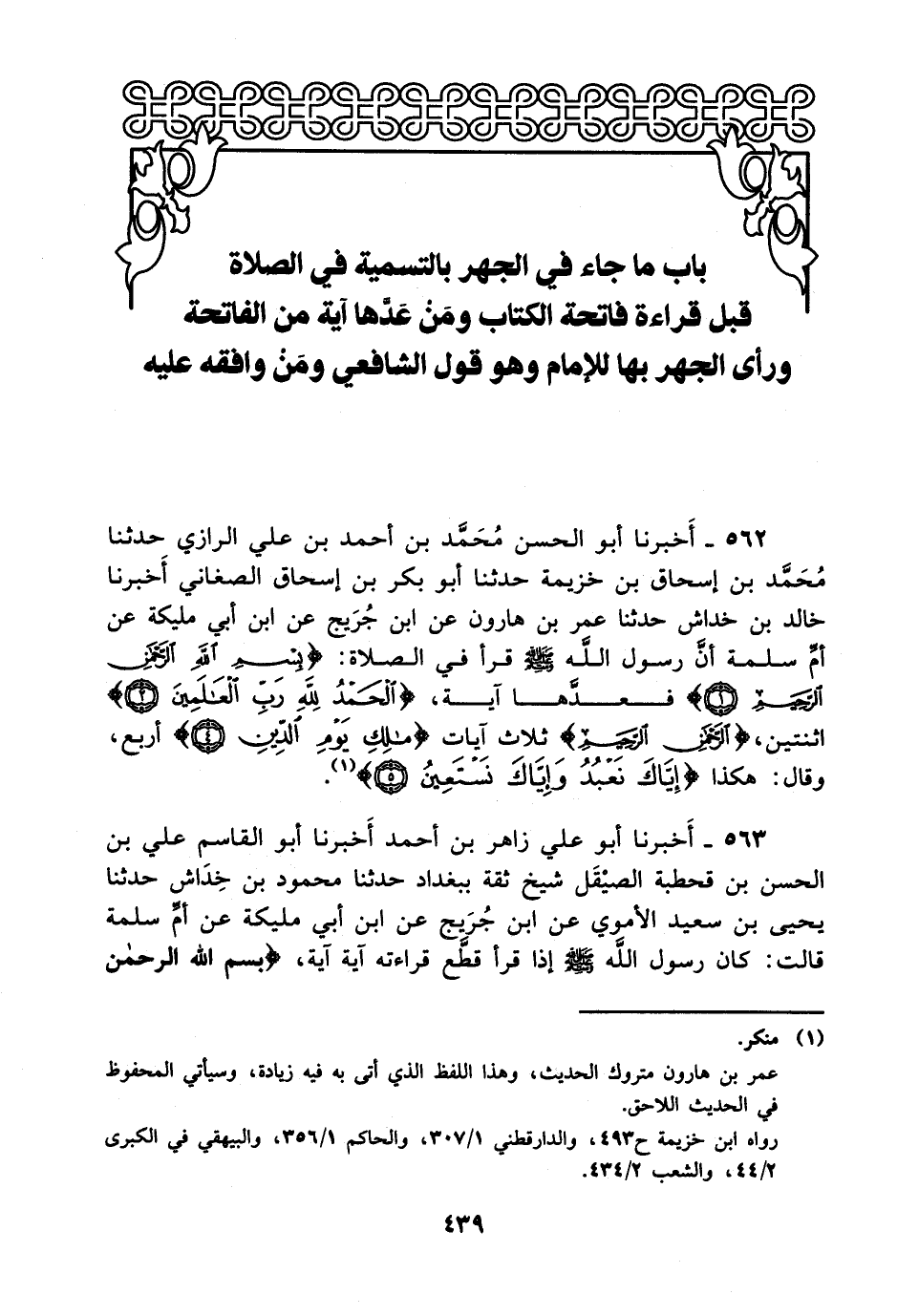 562- أخبرنا أبو الحسين محمد بن أحمد بن علي الرازي حدثنا محمد بن إسحاق بن خزيمة حدثنا أبو بكر بن إسحاق الصغاني أخبرنا خالد بن خداش حدثنا عمر بن هارون عن ابن جريج عن ابن أبي مليكة عن أم سلمة أن رسول الله صلى الله عليه وسلم قرأ في الصلاة {بسم الله الرحمن الرحيم} فعدها آية {الحمد لله رب العالمين} اثنتين {الرحمن الرحيم} ثلاث آيات {مالك يوم الدين} أربع وقال: هكذا {إياك نعبد وإياك نستعين} .