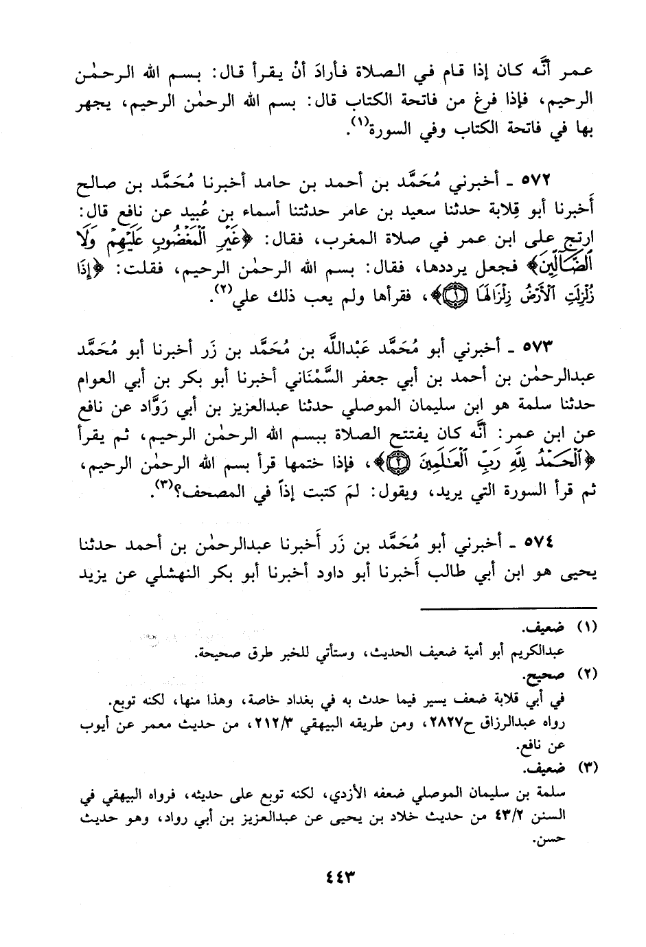 573- أخبرنا أبو محمد عبد الله بن محمد بن زر أخبرنا أبو محمد عبد الرحمن بن أحمد بن أبي جعفر السمناني أخبرنا أبو بكر بن أبي العوام حدثنا سلمة هو ابن سليمان الموصلي حدثنا عبد العزيز بن أبي رواد عن نافع عن ابن عمر: أنه كان يفتتح الصلاة ببسم الله الرحمن الرحيم ثم يقرأ {الحمد لله رب العالمين} فإذا ختمها قرأ بسم الله الرحمن الرحيم ثم قرأ السورة التي يريد ويقول: لم كتبت إذا في المصحف؟