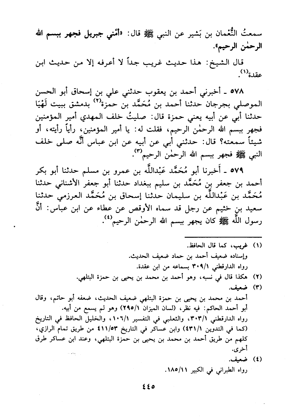 578- أخبرني أحمد بن يعقوب حدثني علي بن إسحاق أبو الحسن الموصلي بجرجان حدثنا أحمد بن محمد بن حمزة بدمشق ببيت لهيا حدثنا أبي عن أبيه يعني حمزة قال: صليت خلف المهدي أمير المؤمنين فجهر ببسم الله الرحمن الرحيم فقلت له: ياأمير المؤمنين رأيا رأيته أو شيئا سمعته؟ قال: حدثني أبي عن أبيه عن ابن عباس أنه صلى خلف النبي صلى الله عليه وسلم فجهر ببسم الله الرحمن الرحيم.
