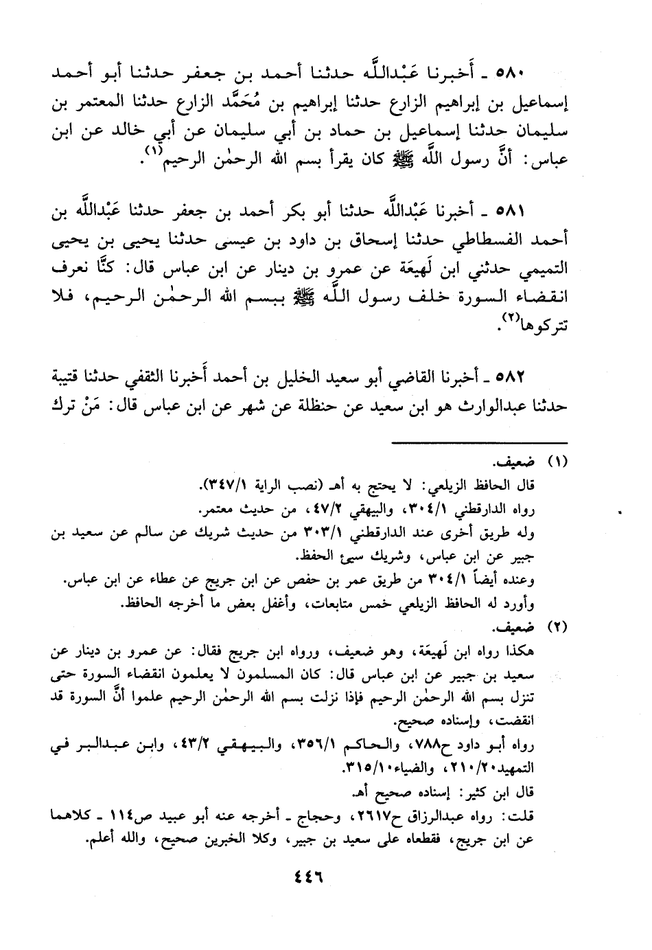 581- أخبرنا عبد الله حدثنا أبو بكر أحمد بن جعفر حدثنا عبد الله بن أحمد الفسطاطي حدثنا إسحاق بن داود بن عيسى حدثنا يحيى بن يحيى التميمي حدثني ابن لهيعة عن عمرو بن دينار عن ابن عباس قال: كنا نعرف انقضاء السورة خلف رسول الله صلى الله عليه وسلم ببسم الله الرحمن الرحيم فلا تتركوها.