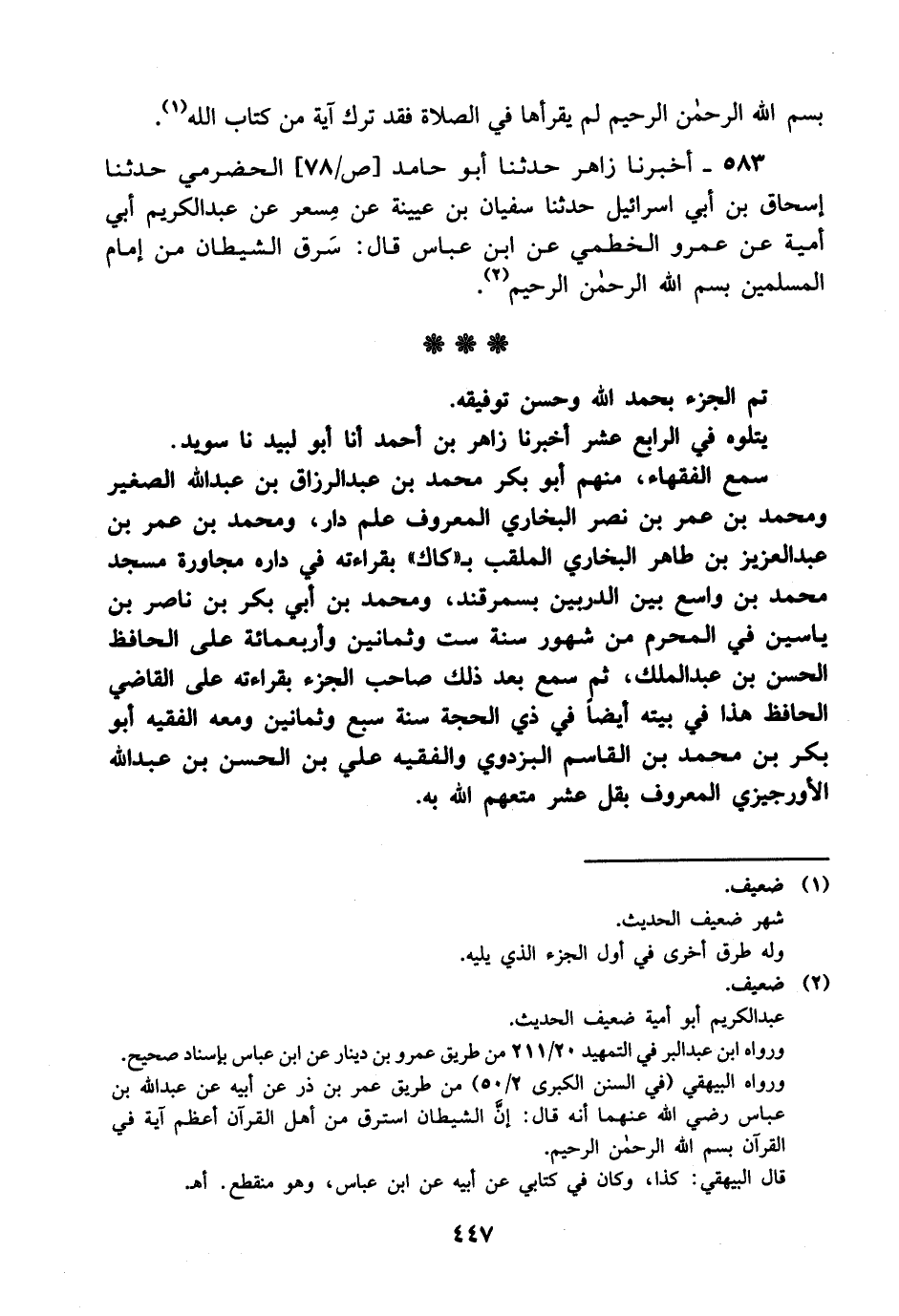 583- أخبرنا زاهر حدثنا أبو حامد الحضرمي حدثنا إسحاق بن أبي إسرائيل حدثنا سفيان بن عيينة عن مسعر، عَن عَبد الكريم أبي أمية عن عمرو الخطمي عن ابن عباس قال: سرق الشيطان من إمام المسلمين بسم الله الرحمن الرحيم.
