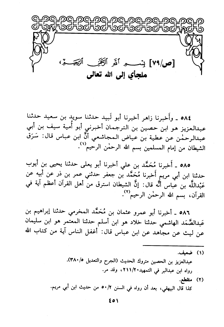 585- أخبرنا محمد بن علي أخبرنا أبو يعلى حدثنا يحيى بن أيوب حدثنا ابن أبي مريم أخبرنا محمد بن جعفر حدثني عمر بن ذر عن أبيه، عَن عَبد الله بن عباس أنه قال: إن الشيطان استرق من أهل القرآن أعظم آية في القرآن بسم الله الرحمن الرحيم.