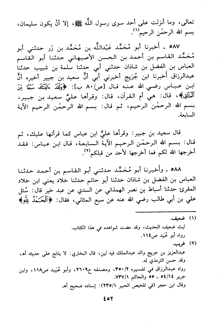 587- أخبرنا أبو محمد عبد الله بن محمد بن زر حدثني أبو محمد القاسم بن أحمد بن الحسن الأصبهاني حدثنا أبو القاسم العباس بن الفضل بن شاذان حدثني أبي حدثنا سلمة بن شبيب حدثنا عبد الرزاق أخبرنا ابن جريج أخبرني أبي أن سعيد بن جبير أخبره أن ابن عباس رضي الله عنه قال {ولقد ءاتينك سبعا من المثانى} قال: هي أم القرآن قال: وقرأها علي سعيد بن جبير بسم الله الرحمن الرحيم ثم قال: بسم الله الرحمن الرحيم الآية السابعة.