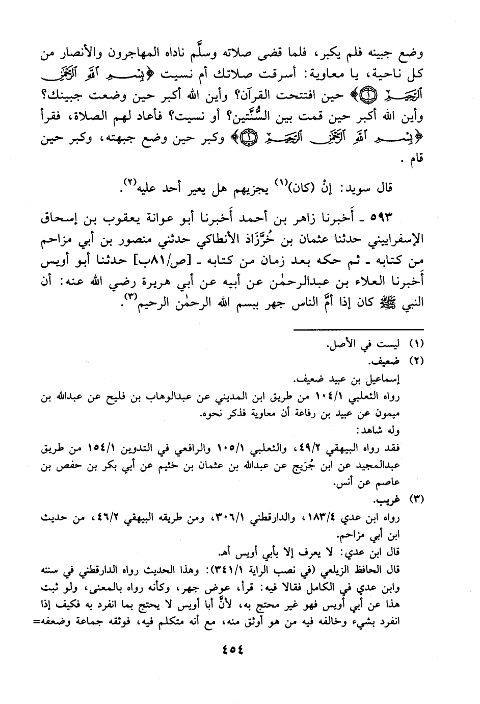 593- أخبرنا زاهر بن أحمد أخبرنا أبو عوانة يعقوب بن إسحاق الإسفراييني حدثنا عثمان بن خرزاذ الأنطاكي حدثني منصور بن أبي مزاحم من كتابه - ثم حكه بعد زمان من كتابه - حدثنا أبو أويس أخبرنا العلاء بن عبد الرحمن عن أبيه، عَن أبي هريرة رضي الله عنه أن النبي صلى الله عليه وسلم كان إذا أم الناس جهر ببسم الله الرحمن الرحيم.