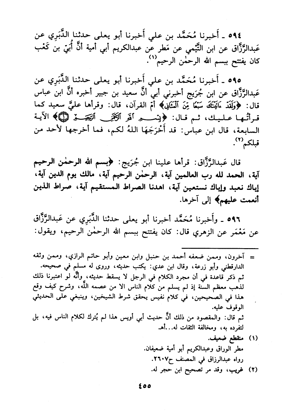 596- وأخبرنا محمد أخبرنا أبو يعلى حدثنا الدبري، عَن عَبد الرزاق عن معمر عن الزهري قال: كان يفتتح ببسم الله الرحمن الرحيم ويقول: -[456]- آية من كتاب الله تركها الناس.