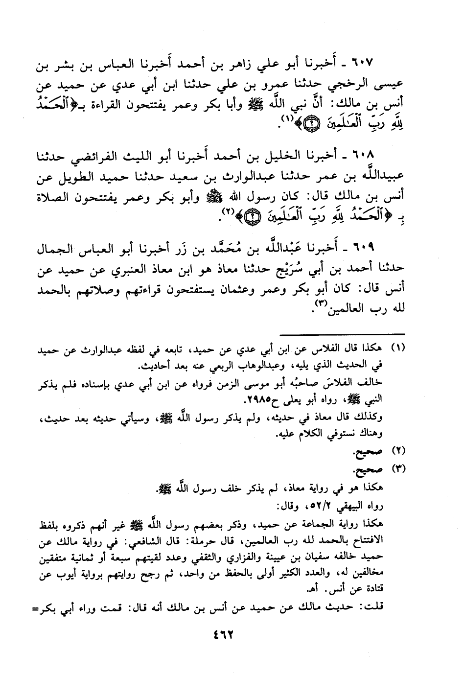 609- أخبرنا عبد الله بن محمد بن زر أخبرنا أبو العباس الجمال حدثنا أحمد بن أبي سريج حدثنا معاذ هو ابن معاذ العنبري عن حميد عن أنس قال: كان أبو بكر وعمر وعثمان يستفتحون قراءتهم وصلاتهم بالحمد لله رب العالمين.