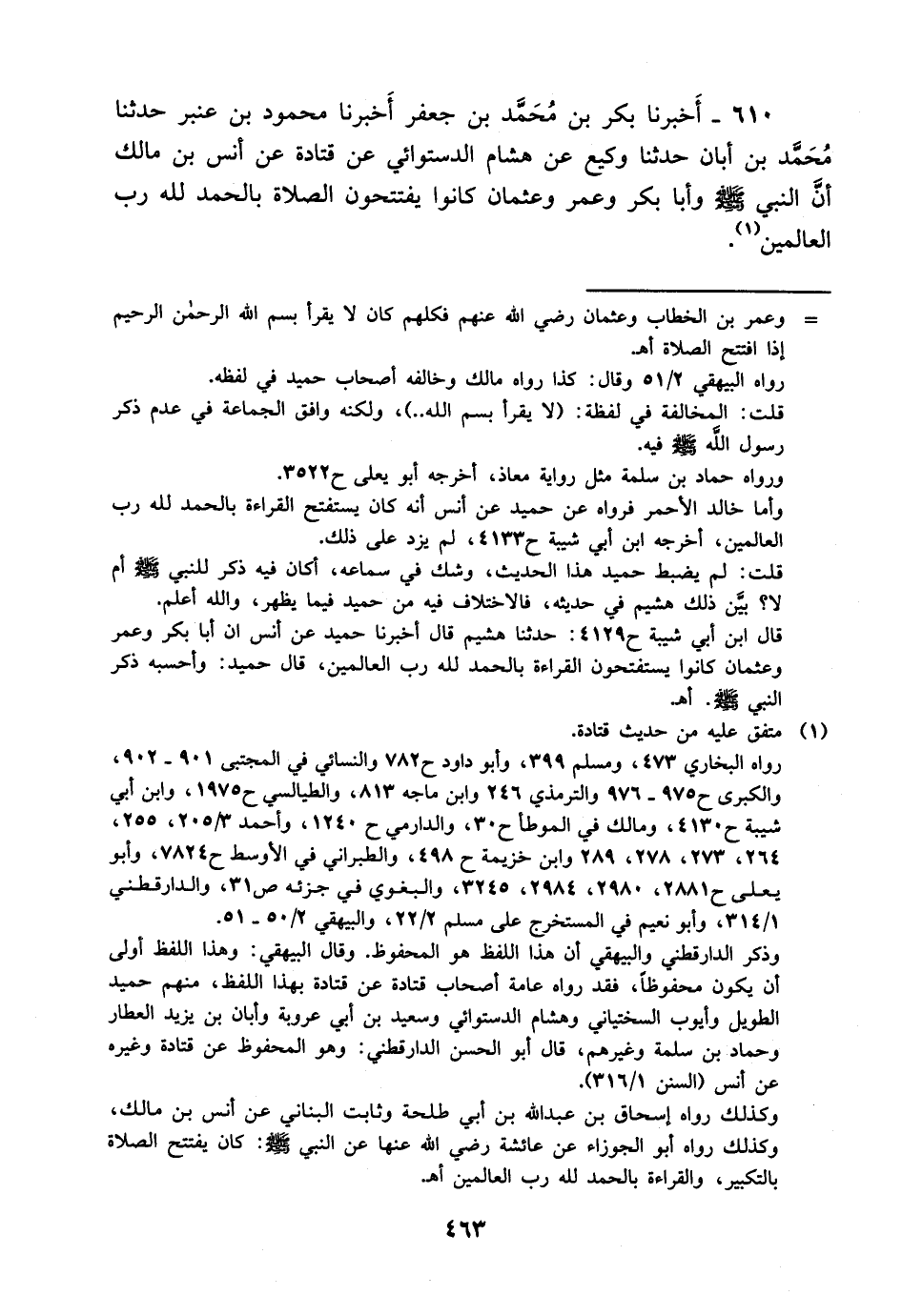 610- أخبرنا بكر بن محمد بن جعفر أخبرنا محمود بن عنبر حدثنا محمد بن أبان حدثنا وكيع عن هشام الدستوائي عن قتادة عن أنس بن مالك أن النبي صلى الله عليه وسلم وأبا بكر وعمر وعثمان كانوا يفتتحون الصلاة بالحمد لله رب العالمين.