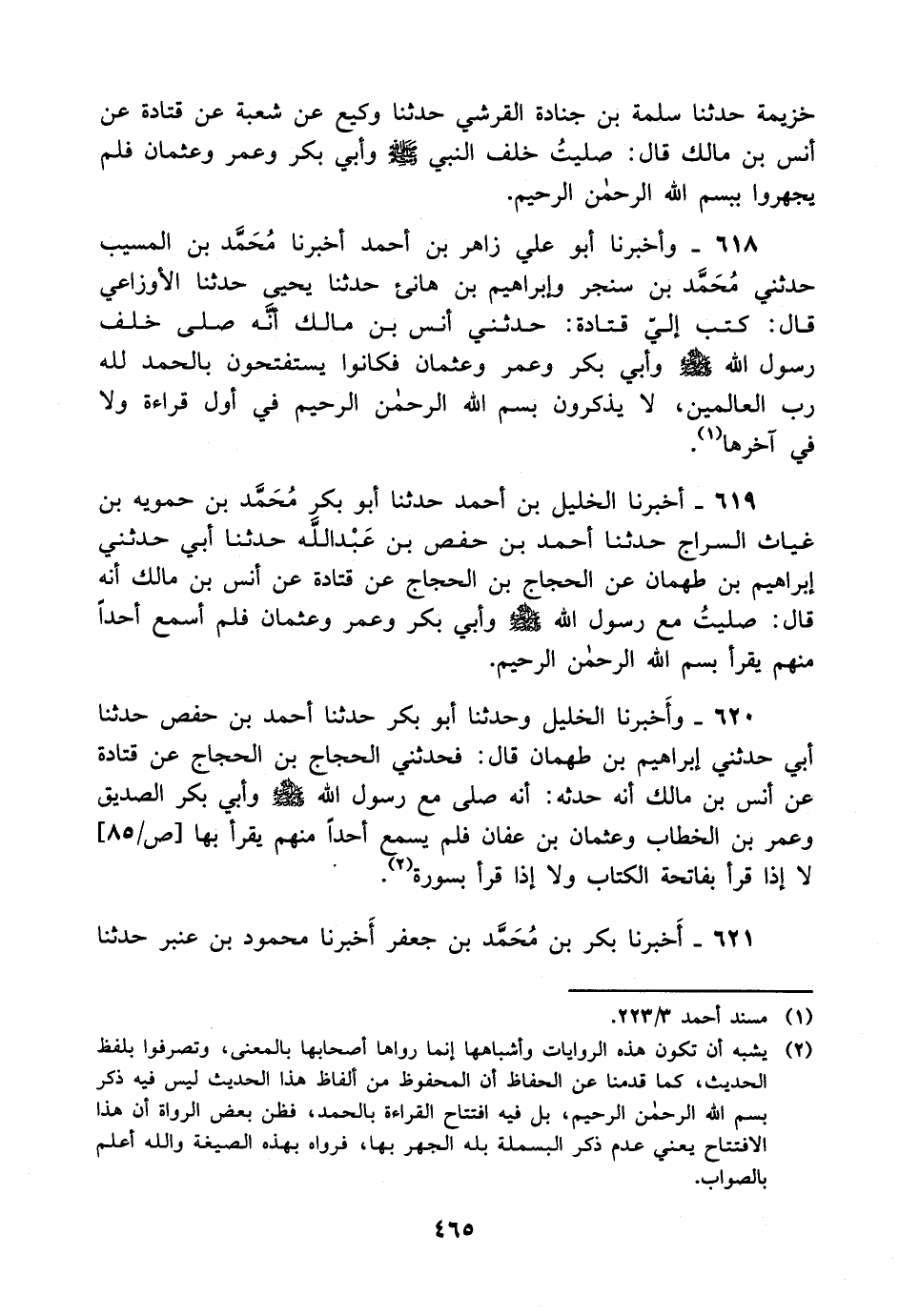 619- أخبرناالخليل بن أحمد حدثنا أبو بكر محمد بن حموية بن غياث السراج حدثنا أحمد بن حفص بن عبد الله حدثنا أبي حدثني إبراهيم بن طهمان عن الحجاج بن الحجاج عن قتادة عن أنس بن مالك أنه قال: صليت مع رسول الله صلى الله عليه وسلم وأبي بكر وعمر وعثمان فلم أسمع أحدا منهم يقرأ بسم الله الرحمن الرحيم.