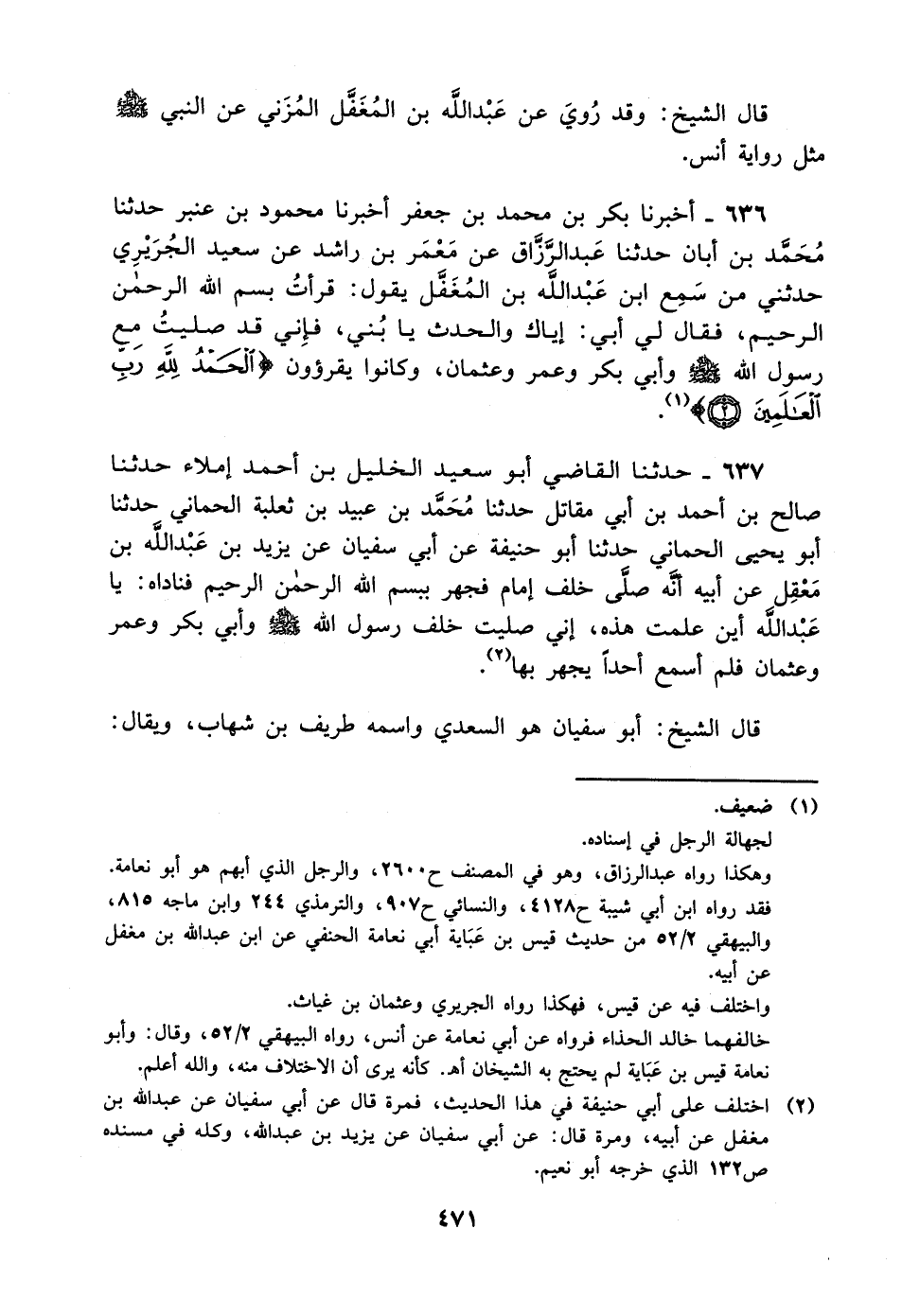 637- حدثنا القاضي أبو سعيد الخليل بن أحمد إملاء حدثنا صالح بن أحمد بن أبي مقاتل حدثنا محمد بن عبيد بن ثعلبة الحماني حدثنا أبو يحيى الحماني حدثنا أبو حنيفة، عَن أبي سفيان عن يزيد بن عبد الله بن معقل عن أبيه أنه صلى خلف إمام فجهر ببسم الله الرحمن الرحيم فناداه: ياعبد الله أين علمت هذه إني صليت خلف رسول الله صلى الله عليه وسلم وأبي بكر وعمر وعثمان فلم أسمع أحدا يجهر بها.