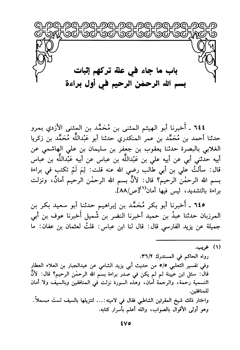 644- أخبرنا أبو الهيثم المثنى بن محمد بن المثنى الأزدي بمرو حدثنا أحمد بن محمد بن عمر المنكدري حدثنا أبو عبد الله محمد بن زكريا الغلابي بالبصرة حدثنا يعقوب بن جعفر بن سليمان بن علي الهاشمي عن أبيه حدثني أبي عن أبيه علي بن عبد الله بن عباس عن أبيه عبد الله بن عباس قال: سألت علي بن أبي طالب رضي الله عنه قلت: لم لم تكتب في براءة بسم الله الرحمن الرحيم؟ قال: لأن بسم الله الرحمن الرحيم أمان ونزلت براءة بالتشديد ليس فيها أمان.