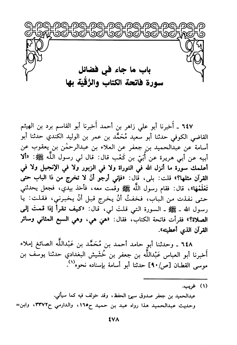 647- أخبرنا أبو علي زاهر بن أحمد أخبرنا أبو القاسم برد بن الهيثم القاضي الكوفي حدثنا أبو سعيد محمد بن عمر بن الوليد الكندي حدثنا أبو أسامة، عَن عَبد الحميد بن جعفر عن العلاء بن عبد الرحمن بن يعقوب عن أبيه، عَن أبي هريرة، عَن أبي بن كعب قال: قال لي رسول الله صلى الله عليه وسلم: ألا أعلمك سورة ما أنزل الله في التوراة، ولاَ في الزبور، ولاَ في الإنجيل، ولاَ في القرآن مثلها؟ قلت: بلى قال: فإني أرجو أن لا تخرج من ذا الباب حتى تعلمها قال: فقام رسول الله صلى الله عليه وسلم وقمت معه فأخذ بيدي فجعل يحدثني حتى نفذت من الباب فخفت أن يخرج قبل أن يخبرني فقلت: يا رسول الله - صلى الله عليه وسلم - السورة التي قلت لي قال: كيف تقرأ إذا قمت إلى الصلاة؟ فقرأت فاتحة الكتاب فقال: هي هي وهي السبع المثاني وسائر القرآن الذي أعطيته.