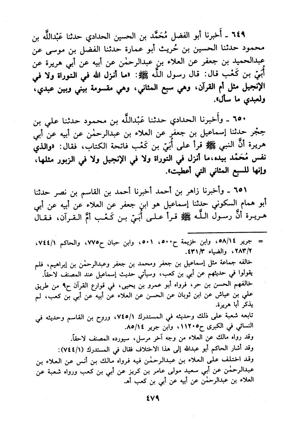650- وأخبرنا الحدادي حدثنا عبد الله بن محمود حدثنا علي بن حجر حدثنا إسماعيل بن جعفر عن العلاء بن عبد الرحمن عن أبيه، عَن أبي هريرة أن النبي صلى الله عليه وسلم قرأ على أبي بن كعب فاتحة الكتاب فقال: والذي نفس محمد بيده ما أنزل في التوراة، ولاَ في الإنجيل، ولاَ في الزبور مثلها وإنها للسبع المثاني التي أعطيت.