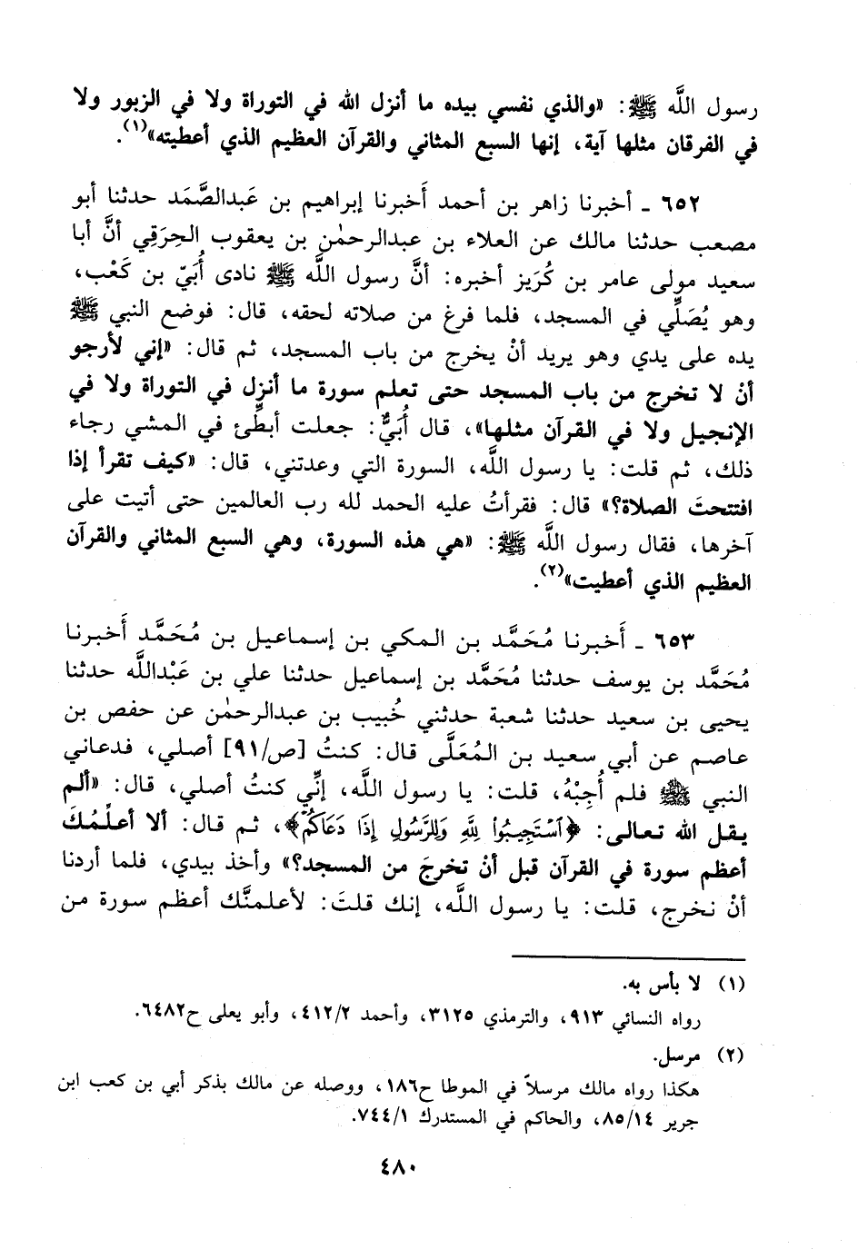652- أخبرنا زاهر بن أحمد أخبرنا إبراهيم بن عبد الصمد حدثنا أبو مصعب حدثنا مالك عن العلاء بن عبد الرحمن بن يعقوب الحرقي أن أبا سعيد مولى عامر بن كريز أخبره: أن رسول الله صلى الله عليه وسلم نادى أبي بن كعب وهو يصلي في المسجد فلما فرغ من صلاته لحقه قال: فوضع النبي صلى الله عليه وسلم يده على يدي وهو يريد أن يخرج من باب المسجد ثم قال: إني لأرجو أن لا تخرج من باب المسجد حتى تعلم سورة ما أنزل في التوارة، ولاَ في الإنجيل، ولاَ في القرآن مثلها قال أبي: جعلت أبطئ في المشي رجاء ذلك ثم قلت: يا رسول الله السورة التي وعدتني قال: كيف تقرأ إذا افتتحت الصلاة؟ قال: فقرأت عليه الحمد لله رب العالمين حتى أتيت على آخرها فقال رسول الله صلى الله عليه وسلم: هي هذه السورة وهي السبع المثاني والقرآن العظيم الذي أعطيت.