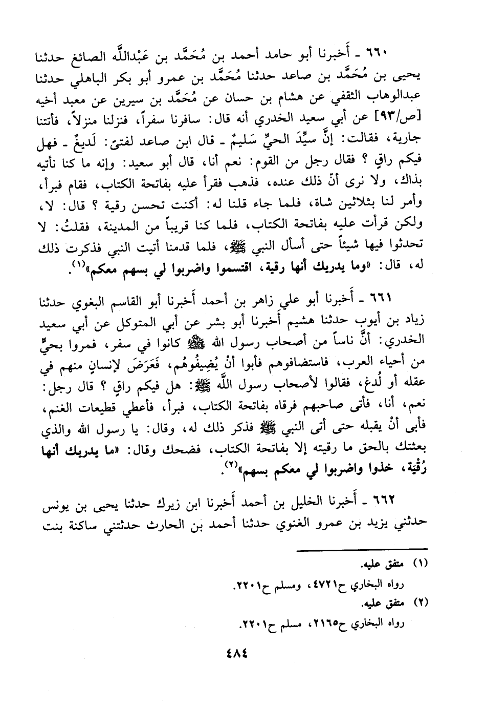 661- أخبرنا أبو علي زاهر بن أحمد أخبرنا أبو القاسم البغوي حدثنا زياد بن أيوب حدثنا هشيم أخبرنا أبو بشر، عَن أبي المتوكل، عَن أبي سعيد الخدري: أن ناسا من أصحاب رسول الله صلى الله عليه وسلم كانوا في سفر فمروا بحي من أحياء العرب فاستضافوهم فأبوا أن يضيفوهم فعرض لإنسان منهم في عقله أو لدغ فقالوا لأصحاب رسول الله صلى الله عليه وسلم: هل فيكم راق؟ قال رجل: نعم أنا فأتى صاحبهم فرقاه بفاتحة الكتاب فبرأ فأعطى قطيعات الغنم فأبى أن يقبله حتى أتى النبي صلى الله عليه وسلم فذكر ذلك له وقال: يا رسول الله والذي بعثك بالحق ما رقيته إلا بفاتحة الكتاب فضحك وقال: ما يدريك أنها رقية خذوا واضربوا لي معكم بسهم.
