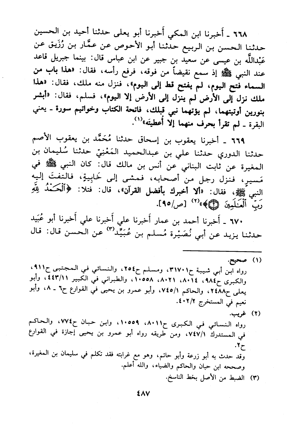 670- أخبرنا أحمد بن عمار أخبرنا علي أخبرنا علي أخبرنا أبو عبيد حدثنا يزيد، عَن أبي نصيرة مسلم بن عبيد عن الحسن قال: قال -[488]- رسول الله صلى الله عليه وسلم: من قرأ فاتحة الكتاب فكأنما قرأ التوراة والإنجيل والزبور والقرآن.
