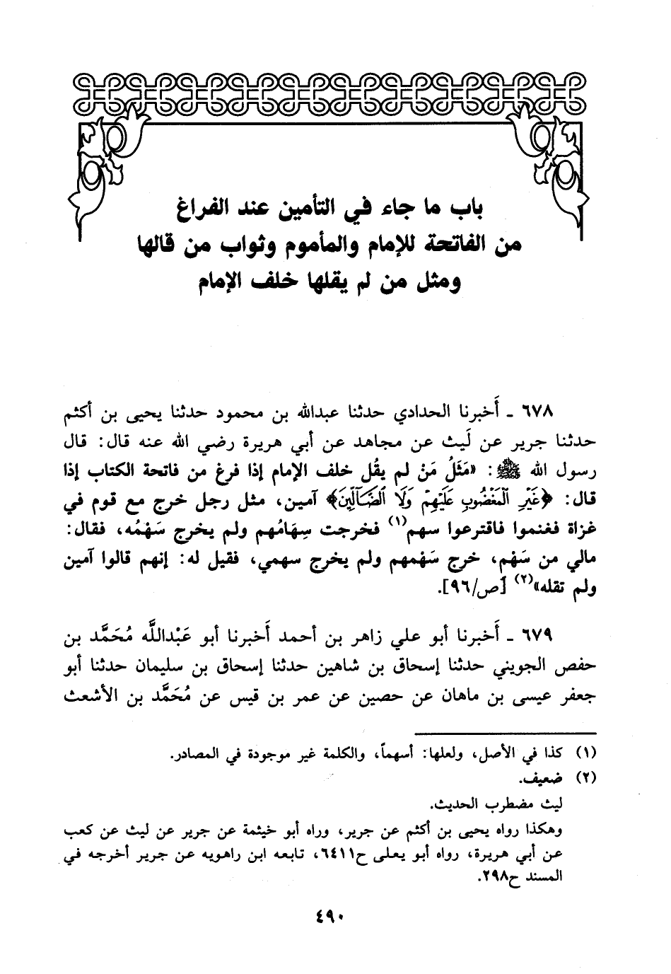678- أخبرنا الحدادي حدثنا عبد الله بن محمود حدثنا يحيى بن أكثم حدثنا جرير عن ليث عن مجاهد، عَن أبي هريرة رضي الله عنه قال: قال رسول الله صلى الله عليه وسلم: مثل من لم يقل خلف الإمام إذا فرغ من فاتحة الكتاب إذا قال {غير المغضوب عليهم، ولاَ الضالين} آمين مثل رجل خرج مع قوم في غزاة فغنموا فاقترعوا سهم فخرجت سهامهم ولم يخرج سهمه فقال: مالي من سهم خرج سهمهم ولم يخرج سهمي فقيل له: إنهم قالوا آمين ولم تقله.