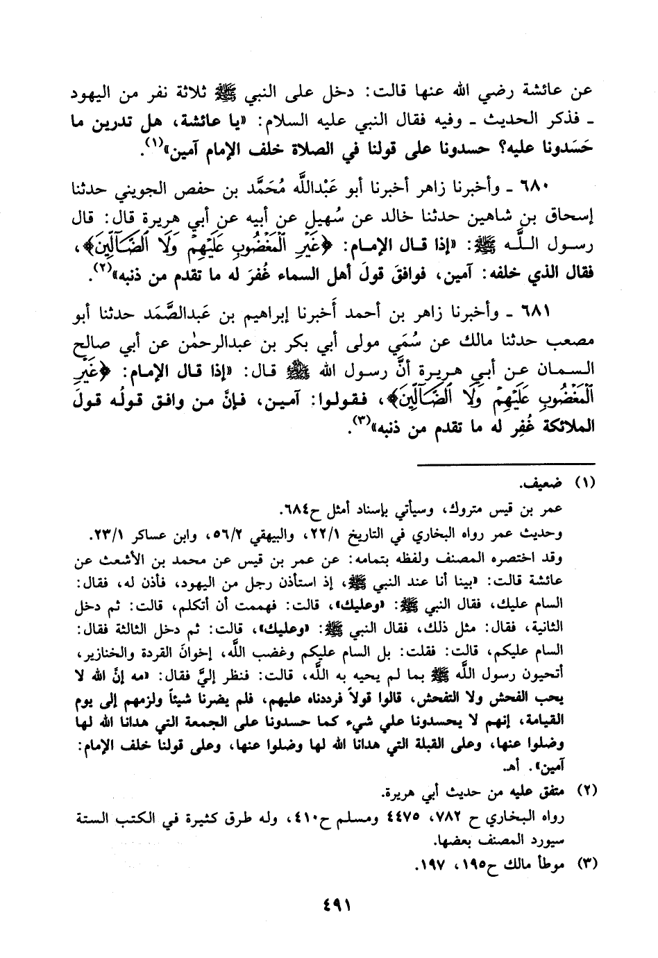 680- وأخبرنا زاهر أخبرنا أبو عبد الله محمد بن حفص الجويني حدثنا إسحاق بن شاهين حدثنا خالد عن سهيل عن أبيه، عَن أبي هريرة قال: قال رسول الله صلى الله عليه وسلم: إذا قال الإمام {غير المغضوب عليهم، ولاَ الضالين} فقال الذي خلفه: آمين فوافق قول أهل السماء غفر له ما تقدم من ذنبه.