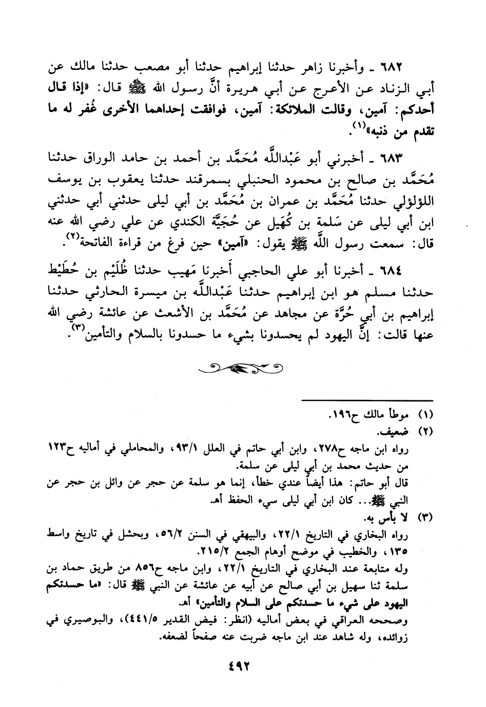 682- وأخبرنا زاهر حدثنا إبراهيم حدثنا أبو مصعب حدثنا مالك، عَن أبي الزناد عن الأعرج، عَن أبي هريرة أن رسول الله صلى الله عليه وسلم قال: إذا قال أحدكم: آمين وقالت الملائكة: آمين فوافقت إحداهما الأخرى غفر له ما تقدم من ذنبه.