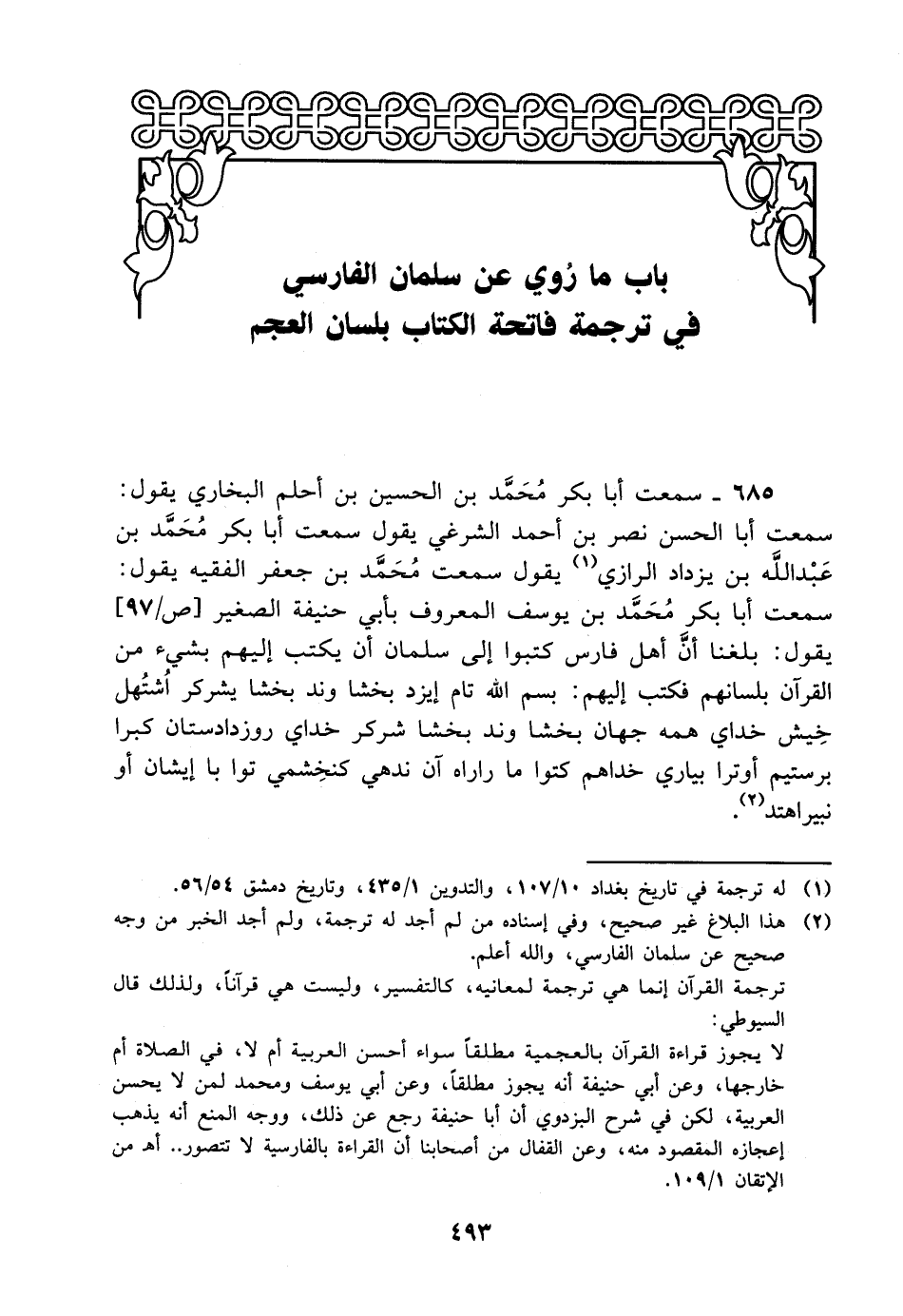 685- سمعت أبا بكر محمد بن الحسين بن أحلم البخاري يقول: سمعت أبا الحسن نصر بن أحمد الشرغي يقول سمعت أبا بكر محمد بن عبد الله بن يزداد الرازي يقول سمعت محمد بن جعفر الفقيه يقول: سمعت أبا بكر محمد بن يوسف المعروف بأبي حنيفة الصغير يقول: بلغنا أن أهل فارس كتبوا إلى سلمان أن يكتب إليهم بشيء من القرآن بلسانهم فكتب إليهم: بسم الله تام إيزد بخشا وند بخشا يشركر اشتهل خيش خداي همه جهان بخشا وند بخشا شركر خداي روزدادستان كبرا برستيم أوترا بياري خداهم كتوا ما راراه آن ندهى كنخشمي توا با إيشان أو نبيرا هتد.