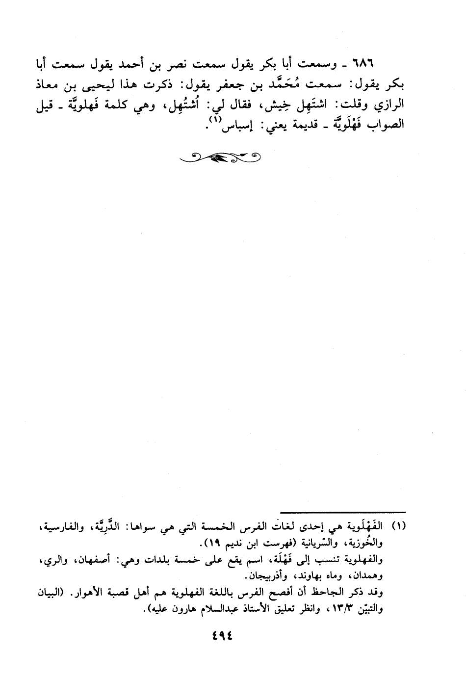 686- وسمعت أبا بكر يقول سمعت نصر بن أحمد يقول سمعت أبا بكر يقول: سمعت محمد بن جعفر يقول: ذكرت هذا ليحيى بن معاذ الرازي وقلت: اشتهل خيش فقال لي: اشتهل وهي كلمة فهلوية – قيل الصواب فهلوية – قديمة يعني: إسباس.