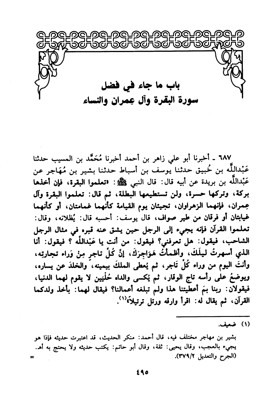 687- أخبرنا أبو علي زاهر بن أحمد أخبرنا محمد بن المسيب حدثنا عبد الله بن خبيق حدثنا يوسف بن أسباط حدثنا بشير بن مهاجر، عَن عَبد الله بن بريدة عن أبيه قال قال النبي صلى الله عليه وسلم: تعلموا البقرة فإن أخذها بركة وتركها حسرة ولن تستطيعها البطلة ثم قال: تعلموا البقرة وآل عمران فإنهما الزهراوان تجيئان يوم القيامة كأنهما غمامتان أو كأنهما غيابتان أو فرقان من طير صواف قال يوسف: أحسبه قال: يظلانه وقال: تعلموا القرآن فإنه يجئ إلى الرجل حين يشق عنه قبره في مثال الرجل الشاحب فيقول: هل تعرفني؟ فيقول: من أنت ياعبد الله؟ فيقول: أنا الذي أسهرت ليلك وأظمأت هواجرك إن كل تاجر من وراء تجارته وأنت اليوم من وراء كل تاجر ثم يعطى الملك بيمينه والخلد عن يساره ويوضع على رأسه تاج الوقار ثم يكسى والداه حليين لا يقوم لهما الدنيا فيقولان: ربنا بم أعطيتنا هذا ولم تبلغه أعمالنا؟ فيقال لهما: بأخذ ولدكما القرآن ثم يقال له: اقرأ وارقه ورتل ترتيلا.