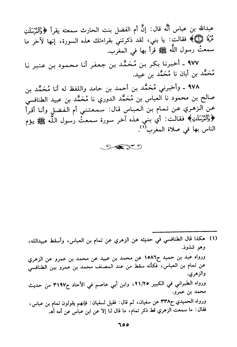 978- وأخبرنا محمد بن أحمد بن حامد واللفظ له، أَخْبَرَنا مُحَمد بن صالح بن محمود، حَدَّثَنا العباس بن محمد الدوري، حَدَّثَنا محمد بن عبيد الطنافسي عن الزهري عن تمام بن العباس قال: سمعتني أم الفضل وأنا أقرأ {والمرسلات} فقالت: أي بني هذه آخر سورة سمعت رسول الله صلى الله عليه وسلم يؤم الناس بها في صلاة المغرب.