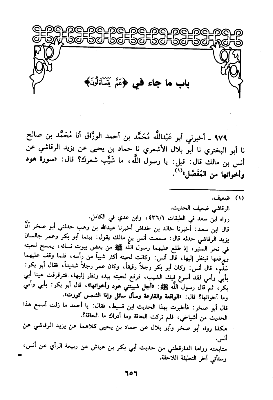 979- أخبرني أبو عبد الله محمد بن أحمد الوراق، أَخْبَرَنا مُحَمد بن صالح، حَدَّثَنا أبو البختري، حَدَّثَنا أبو بلال الأشعري، حَدَّثَنا حماد بن يحيى عن يزيد الرقاشي عن أنس بن مالك قال: قيل: يا رسول الله ما شيب شعرك؟ قال: سورة هود وأخواتها من المفصل.