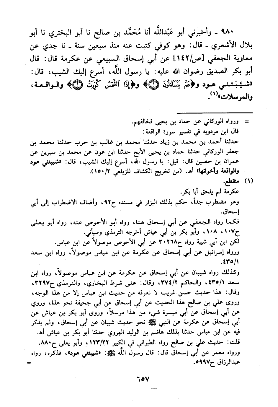 980- وأخبرني أبو عبد الله، أَخْبَرَنا مُحَمد بن صالح، حَدَّثَنا أبو البختري، حَدَّثَنا أبو بلال الأشعري – قال: وهو كوفي كتبت عنه منذ سبعين سنة –، حَدَّثَنا جدي عن معاوية الجعفي، عَن أبي إسحاق السبيعي عن عكرمة قال: قال أبو بكر الصديق رضوان الله عليه: يا رسول الله أسرع إليك الشيب قال: شيبتني هود و {عم يتساءلون} و {إذا الشمس كورت} والواقعة والمرسلات.