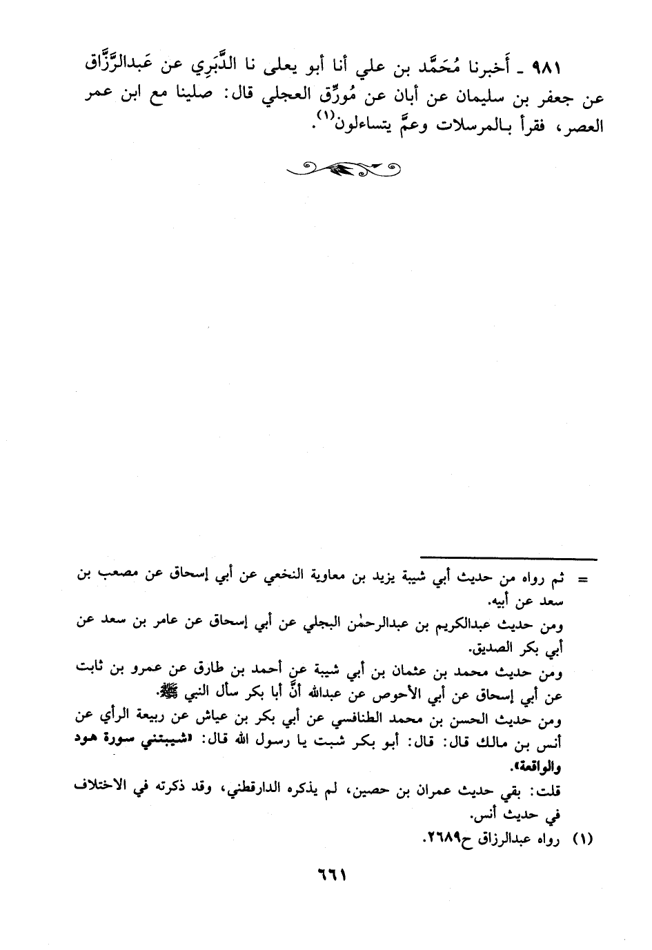 981- أخبرنا محمد بن علي، أخْبَرَنا أبو يعلى، حَدَّثَنا الدبري، عَن عَبد الرزاق عن جعفر بن سليمان عن أبان عن مورق العجلي قال: صلينا مع ابن عمر العصر فقرأ بالمرسلات وعم يتساءلون.