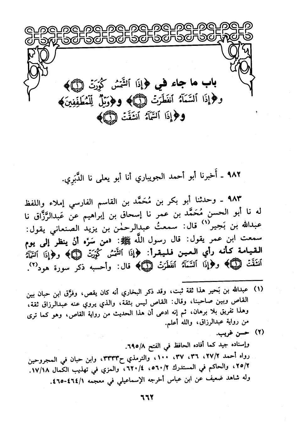 983- وحدثنا أبو بكر بن محمد بن القاسم الفارسي إملاء واللفظ له، حَدَّثَنا أبو الحسن محمد بن عمر، حَدَّثَنا إسحاق بن إبراهيم، عَن عَبد الرزاق، حَدَّثَنا عبد الله بن بحير قال: سمعت عبد الرحمن بن يزيد الصنعاني يقول: سمعت ابن عمر يقول: قال رسول الله صلى الله عليه وسلم: من سره أن ينظر إلى يوم القيامة كأنه رأي العين فليقرأ: {إذا السماء كورت} و {إذا السماء انشقت} و {إذا السماء انفطرت} قال: وأحسبه ذكر سورة هود.