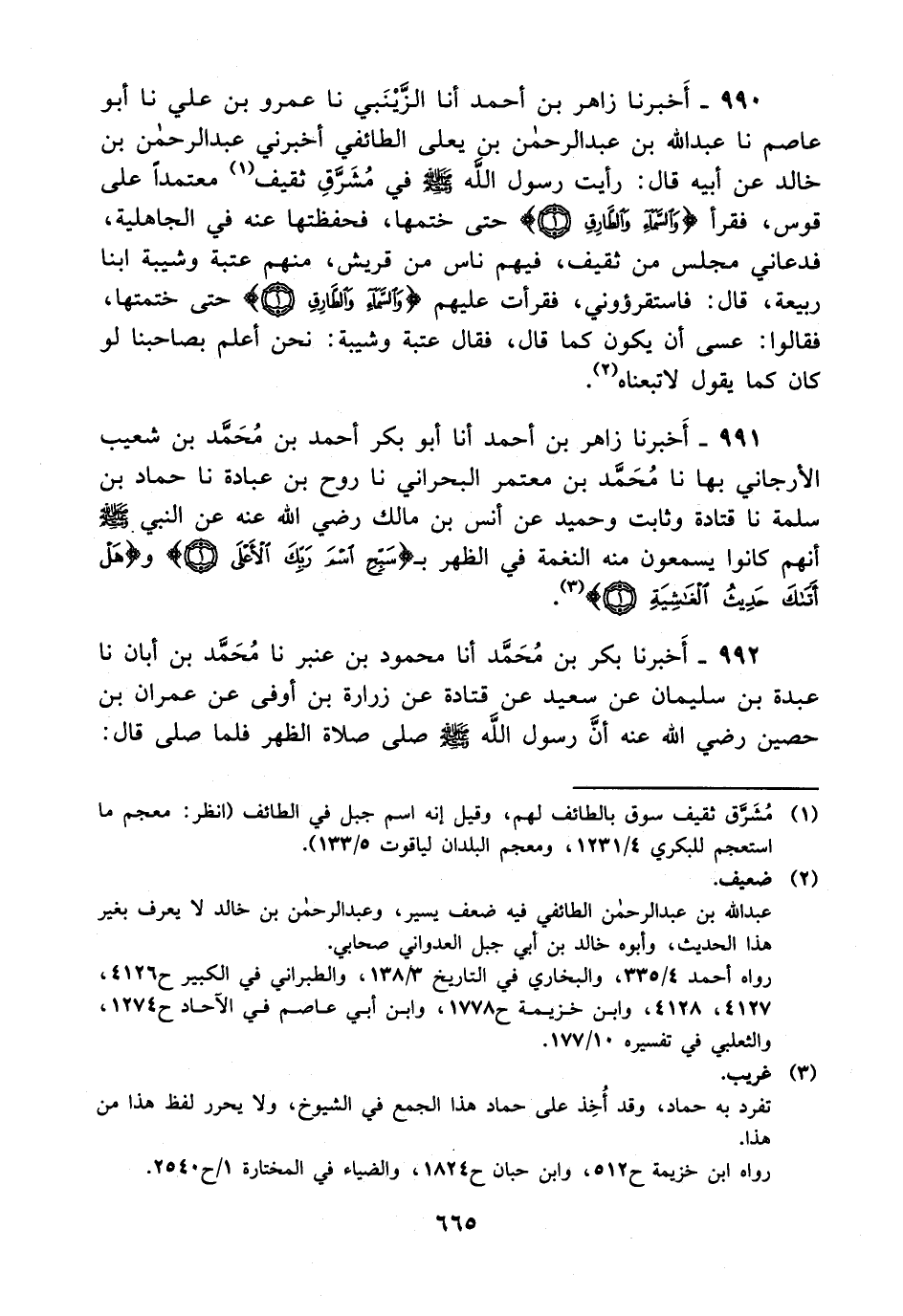 990- أخبرنا زاهر بن أحمد، أَخْبَرَنا الزينبي، حَدَّثَنا عمرو بن علي، حَدَّثَنا أبو عاصم، حَدَّثَنا عبد الله بن عبد الرحمن بن يعلى الطائفي أخبرني عبد الرحمن بن خالد عن أبيه قال: رأيت رسول الله صلى الله عليه وسلم في مشرق ثقيف معتمدا على قوس فقرأ {والسماء والطارق} حتى ختمها فحفظتها عنه في الجاهلية فدعاني مجلس من ثقيف فيهم ناس من قريش منهم عتبة وشيبة ابنا ربيعة قال: فاستقرؤوني فقرأت عليهم {والسماء والطارق} حتى ختمتها فقالوا: عسى أن يكون كما قال فقال عتبة وشيبة: نحن أعلم بصاحبنا لو كان كما يقول لاتبعناه.