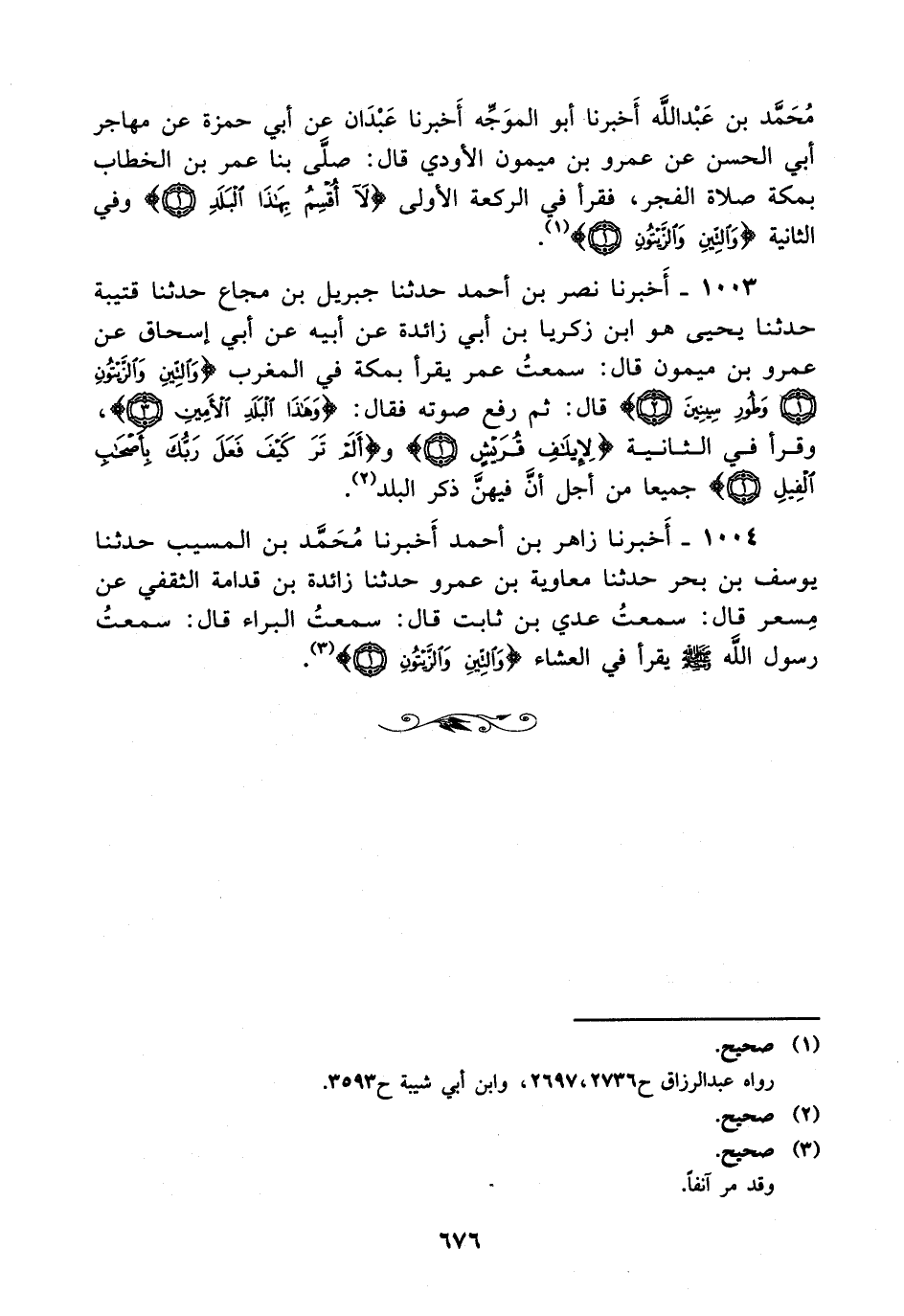 1003- أخبرنا نصر بن أحمد حدثنا جبريل بن مجاع حدثنا قتيبة حدثنا يحيى هو ابن زكريا بن أبي زائدة عن أبيه، عَن أبي إسحاق عن عمرو بن ميمون قال: سمعت عمر يقرأ بمكة في المغرب {والتين والزيتون. وطور سينين} قال: ثم رفع صوته فقال {وهذا البلد الأمين} ، وقرأ في الثانية {لإيلاف قريش} و {ألم تر كيف فعل ربك بأصحاب الفيل} جميعا من أجل أن فيهن ذكر البلد.