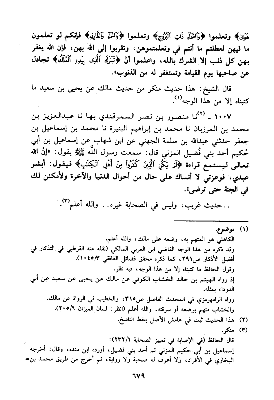 1007- حَدَّثَنا منصور بن نصر السمرقندي بها، حَدَّثَنا عبد العزيز بن محمد بن المرزبان، حَدَّثَنا محمد بن إبراهيم البنيرة، حَدَّثَنا محمد بن إسماعيل بن جعفر حدثني عبد الله بن سلمة الجهني عن ابن شهاب عن إسماعيل بن أبي حكيم أحد بني فضيل المزني قال: سمعت رسول الله صلى الله عليه وسلم يقول: إن الله تعالى ليستمع قراءة {لم يكن الذين كفروا من أهل الكتاب} فيقول: أبشر عبدي فوعزتي لا أنساك على حال من أحوال الدنيا والآخرة ولأمكنن لك في الجنة حتى ترضى.