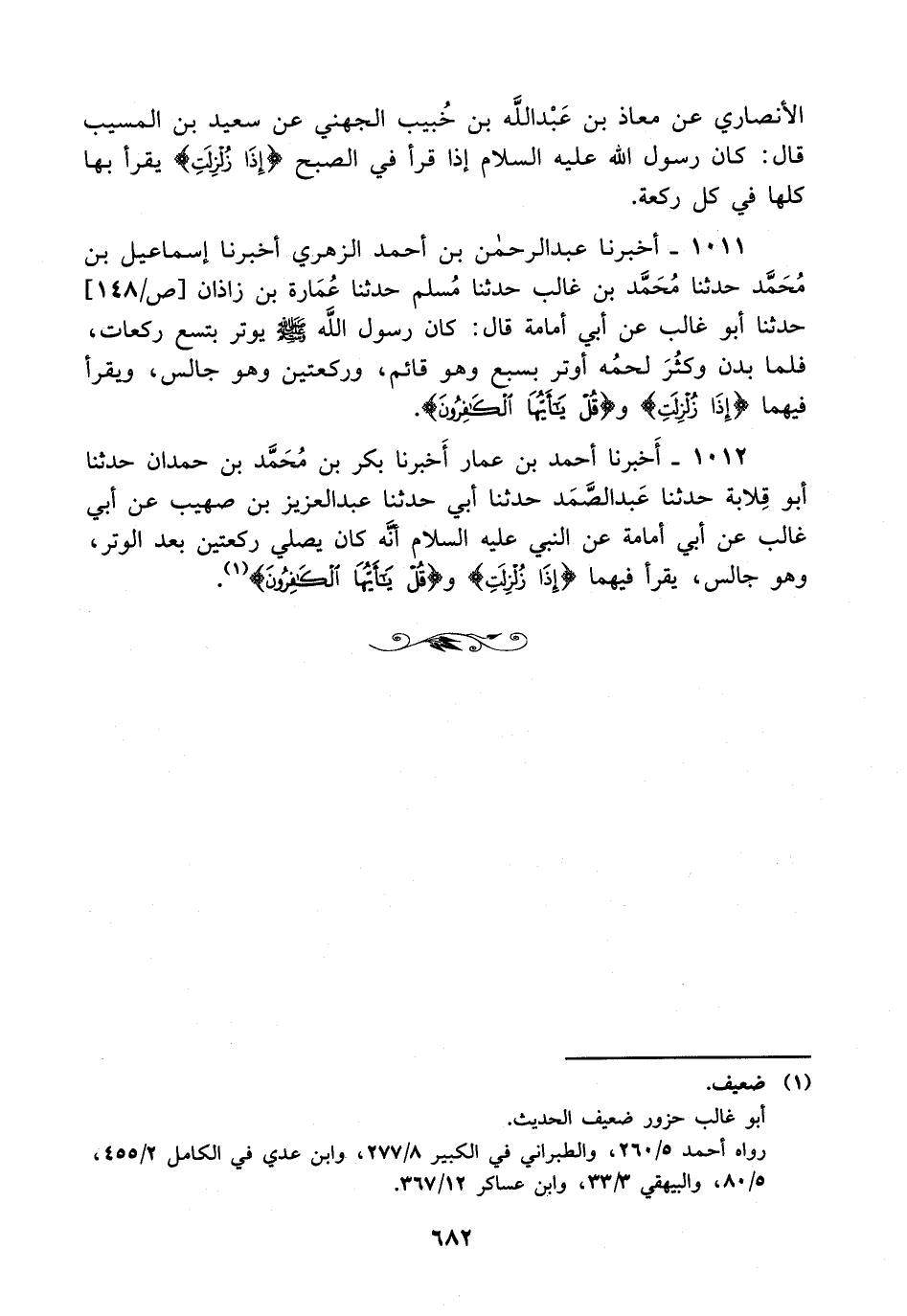 1011- أخبرنا عبد الرحمن بن أحمد الزهري أخبرنا إسماعيل بن محمد حدثنا محمد بن غالب حدثنا مسلم حدثنا عمارة بن زاذان حدثنا أبو غالب، عَن أبي أمامة قال: كان رسول الله صلى الله عليه وسلم يوتر بتسع ركعات فلما بدن وكثر لحمه أوتر بسبع وهو قائم وركعتين وهو جالس ويقرأ فيهما {إذا زلزت} و (قل يا أيها الكافرون} .