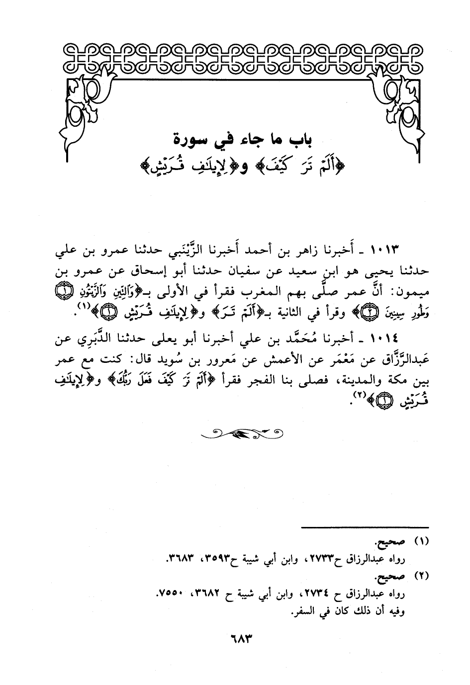 1013- أخبرنا زاهر بن أحمد أخبرنا الزينبي حدثنا عمرو بن علي حدثنا يحيى هو ابن سعيد عن سفيان حدثنا أبو إسحاق عن عمرو بن ميمون: أن عمر صلى بهم المغرب فقرأ في الأولى بـ {والتين والزيتون. وطور سينين} وقرأ في الثانية بـ {ألم تر} و {لإيلاف قريش} .