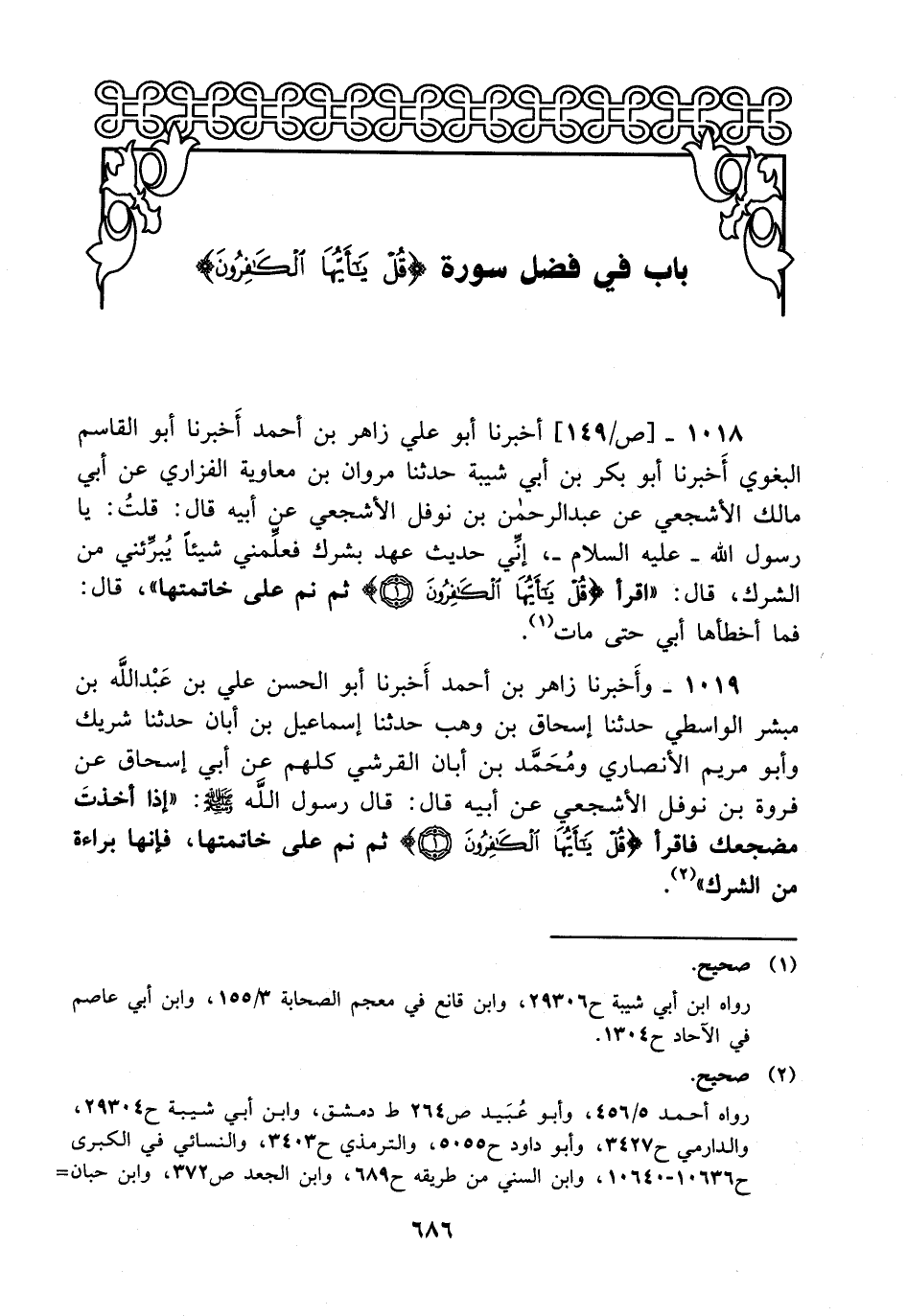1018- أخبرنا أبو علي زاهر بن أحمد أخبرنا أبو القاسم البغوي أخبرنا أبو بكر بن أبي شيبة حدثنا مروان بن معاوية الفزاري، عَن أبي مالك الأشجعي، عَن عَبد الرحمن بن نوفل الأشجعي عن أبيه قال: قلت: يا رسول الله – عليه السلام – إني حديث عهد بشرك فعلمني شيئا يبرئني من الشرك قال: اقرأ {قل يأيها الكافرون} ثم نم على خاتمتها قال: فما أخطأها أبي حتى مات.