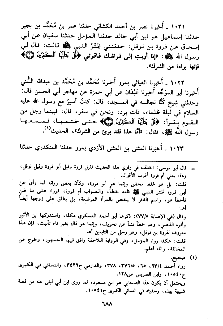 1022- أخبرنا الغياثي بمرو أخبرنا محمد بن محمد بن عبد الله السني أخبرنا أبو الموجه أخبرنا عبدان، عَن أبي حمزة عن مهاجر أبي الحسن قال: وحدثني شيخ كنا نجالسه في المسجد قال: كنت أسير مع رسول الله عليه السلام في ليلة ظلماء ذات برد ونحن في سفر قال: فبينما رجل من القوم يقرأ {قل يأيها الكفرون} حتى ختمها فسمعها رسول الله صلى الله عليه وسلم فقال: أما هذا فقد برئ من الشرك، الحديث.