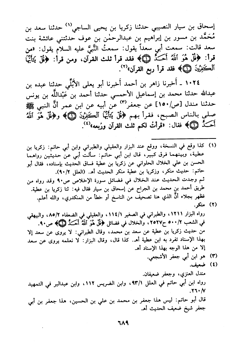 1024- أخبرنا زاهر بن أحمد أخبرنا أبو يعلى الأبلي حدثنا عبده بن عبد الله حدثنا محمد بن إسماعيل الأحمسي حدثنا أحمد بن عبد الله بن يونس حدثنا مندل عن جعفر عن أبيه عن ابن عمر أن النبي صلى الله عليه وسلم صلى بالناس الصبح فقرأ بهم {قل يأيها الكافرون} و {قل هو الله أحد} فقال: قرأت لكم ثلث القرآن وربعه.