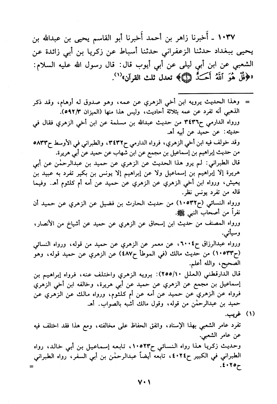1037- أخبرنا زاهر بن أحمد أخبرنا أبو القاسم يحيى بن عبد الله بن يحيى ببغداد حدثنا الزعفراني حدثنا أسباط عن زكريا بن أبي زائدة عن الشعبي عن ابن أبي ليلى، عَن أبي أيوب قال: قال رسول الله عليه السلام: {قل هو الله أحد} تعدل ثلث القرآن.