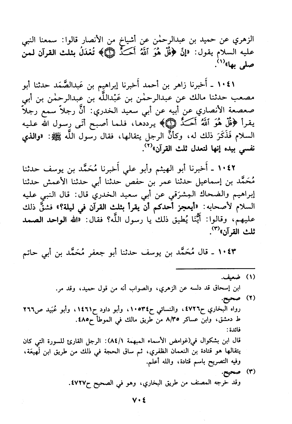 1041- أخبرنا زاهر بن أحمد أخبرنا إبراهيم بن عبد الصمد حدثنا أبو مصعب حدثنا مالك، عَن عَبد الرحمن بن عبد الله بن عبد الرحمن بن أبي صعصعة الأنصاري عن أبيه، عَن أبي سعيد الخدري: أن رجلا سمع رجلا يقرأ {قل هو الله أحد} يرددها فلما أصبح أتى رسول الله عليه السلام فذكر ذلك له وكأن الرجل يتقالها فقال رسول الله صلى الله عليه وسلم: والذي نفسي بيده إنها لتعدل ثلث القرآن.
