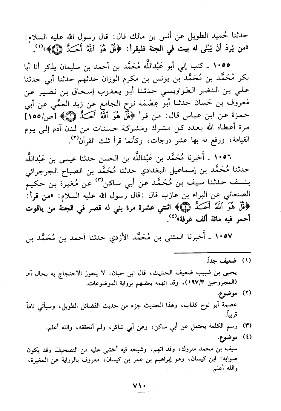 1055- كتب إلى أبو عبد الله محمد بن أحمد بن سليمان يذكر، أَنَّ أبا بكر محمد بن محمد بن يونس بن مكرم الوزان حدثهم حدثنا أبي حدثنا علي بن النضر الطواويسي حدثنا أبو يعقوب إسحاق بن نصير عن معروف بن حسان حدثنا أبو عصمة نوح الجامع عن زيد العمي، عَن أبي حمزة عن ابن عباس قال: من قرأ {قل هو الله أحد} مرة أعطاه الله بعدد كل مشرك ومشركة حسنات من لدن آدم إلى يوم القيامة ورفع له بها عشر درجات وكأنما قرأ ثلث القرآن.