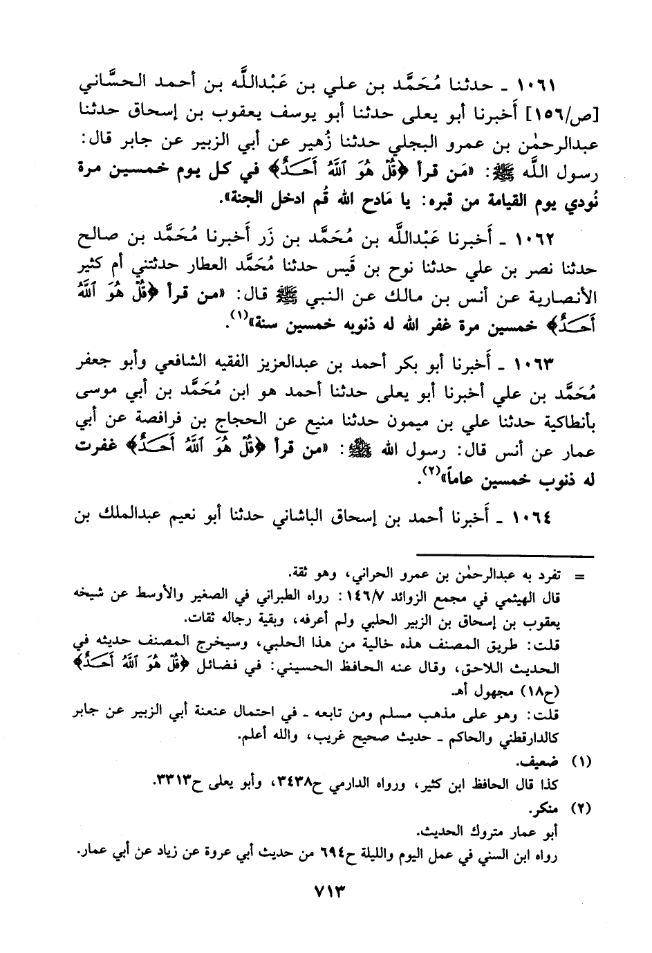 1061- حدثنا محمد بن علي بن عبد الله بن أحمد الحساني أخبرنا أبو يعلى حدثنا أبو يوسف يعقوب بن إسحاق حدثنا عبد الرحمن بن عمرو البجلي حدثنا زهير، عَن أبي الزبير عن جابر قال: رسول الله صلى الله عليه وسلم: من قرأ {قل هو الله أحد} في كل يوم خمسين مرة نودي يوم القيامة من قبره: يامادح الله قم ادخل الجنة.