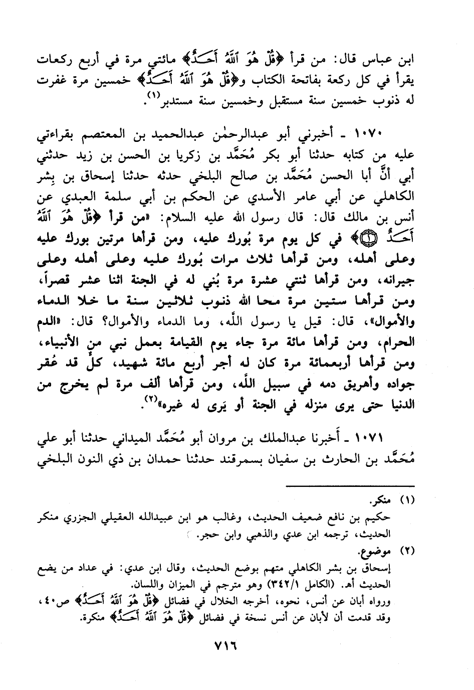 1070- أخبرني أبو عبد الله عبد الحميد بن المعتصم بقراءتي عليه من كتابه حدثنا أبو بكر محمد بن زكريا بن الحسن بن زيد حدثني أبي أن أبا الحسن محمد بن صالح البلخي حدثه حدثنا إسحاق بن بشر الكاهلي، عَن أبي عامر الأسدي عن الحكم بن أبي سلمة العبدي عن أنس بن مالك قال: قال رسول الله عليه السلام: من قرأ {قل هو الله أحد} في كل يوم مرة بورك عليه، وَمن قرأها مرتين بورك عليه وعلى أهله، وَمن قرأها ثلاث مرات بورك عليه وعلى أهله وعلى جيرانه، وَمن قرأها ثنتي عشرة مرة بني له في الجنة اثنا عشر قصرا، وَمن قرأها ستين مرة محا الله ذنوب ثلاثين سنة ما خلا الدماء والأموال قال: قيل يا رسول الله وما الدماء والأموال؟ قال: الدم الحرام، وَمن قرأها مائة مرة جاء يوم القيامة بعمل نبي من الأنبياء ومن قرأها أربعمائة مرة كان له أجر أربع مائة شهيد كل قد عقر جواده وأهريق دمه في سبيل الله، وَمن قرأها ألف مرة لم يخرج من الدنيا حتى يرى منزلة في الجنة أو يرى له غيره.