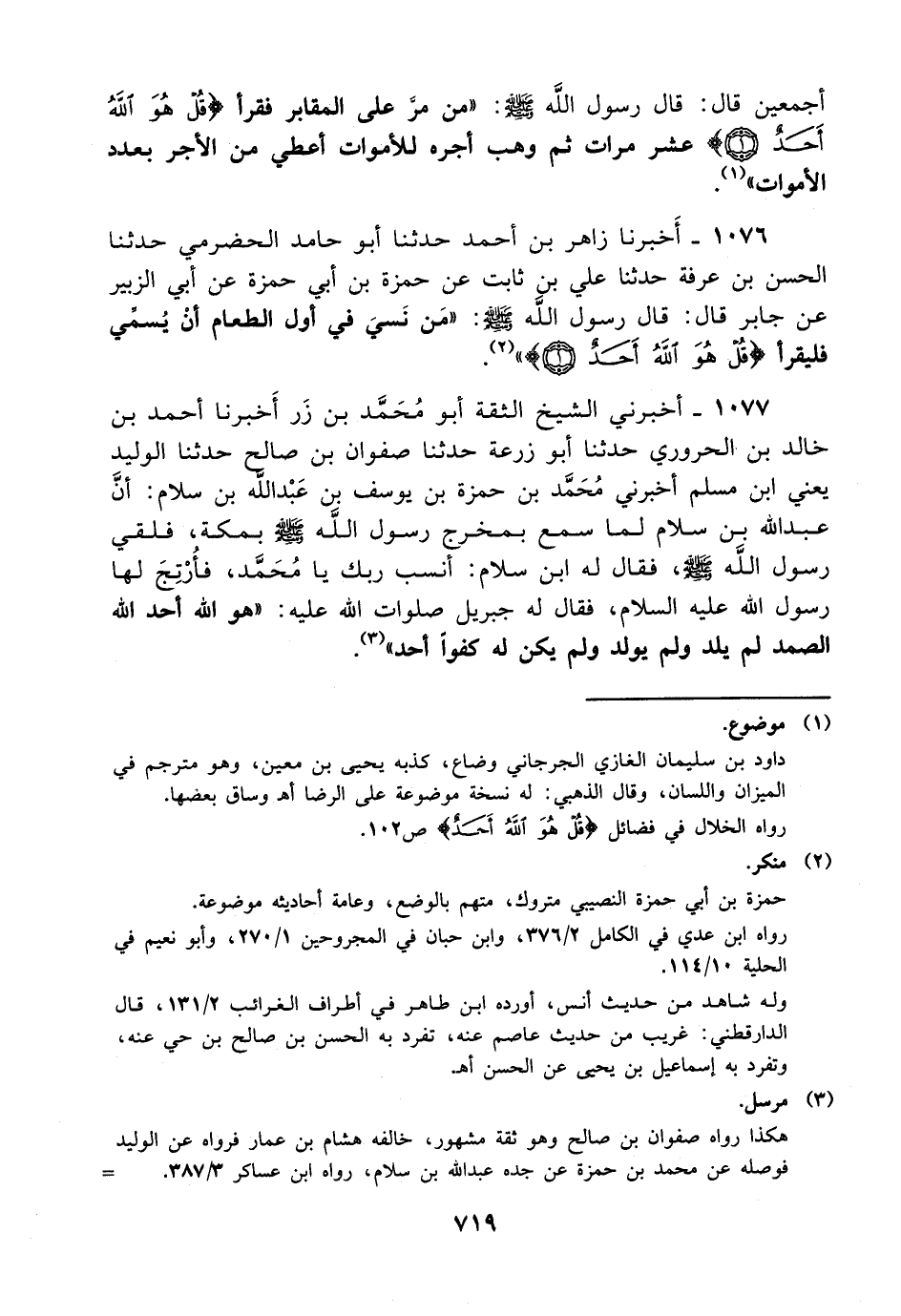 1077- أخبرني الشيخ الثقة أبو محمد بن زر أخبرنا أحمد بن خالد بن الحروري حدثنا أبو زرعة حدثنا صفوان بن صالح حدثنا الوليد يعني ابن مسلم أخبرني محمد بن حمزة بن يوسف بن عبد الله بن سلام: أن عبد الله بن سلام لما سمع بمخرج رسول الله صلى الله عليه وسلم بمكة فلقي رسول الله صلى الله عليه وسلم فقال له ابن سلام: أنسب ربك يامحمد فارتج لها رسول الله عليه السلام فقال له جبريل صلوات الله عليه: هو الله أحد الله الصمد لم يلد ولم يولد ولم يكن له كفوا أحدا.