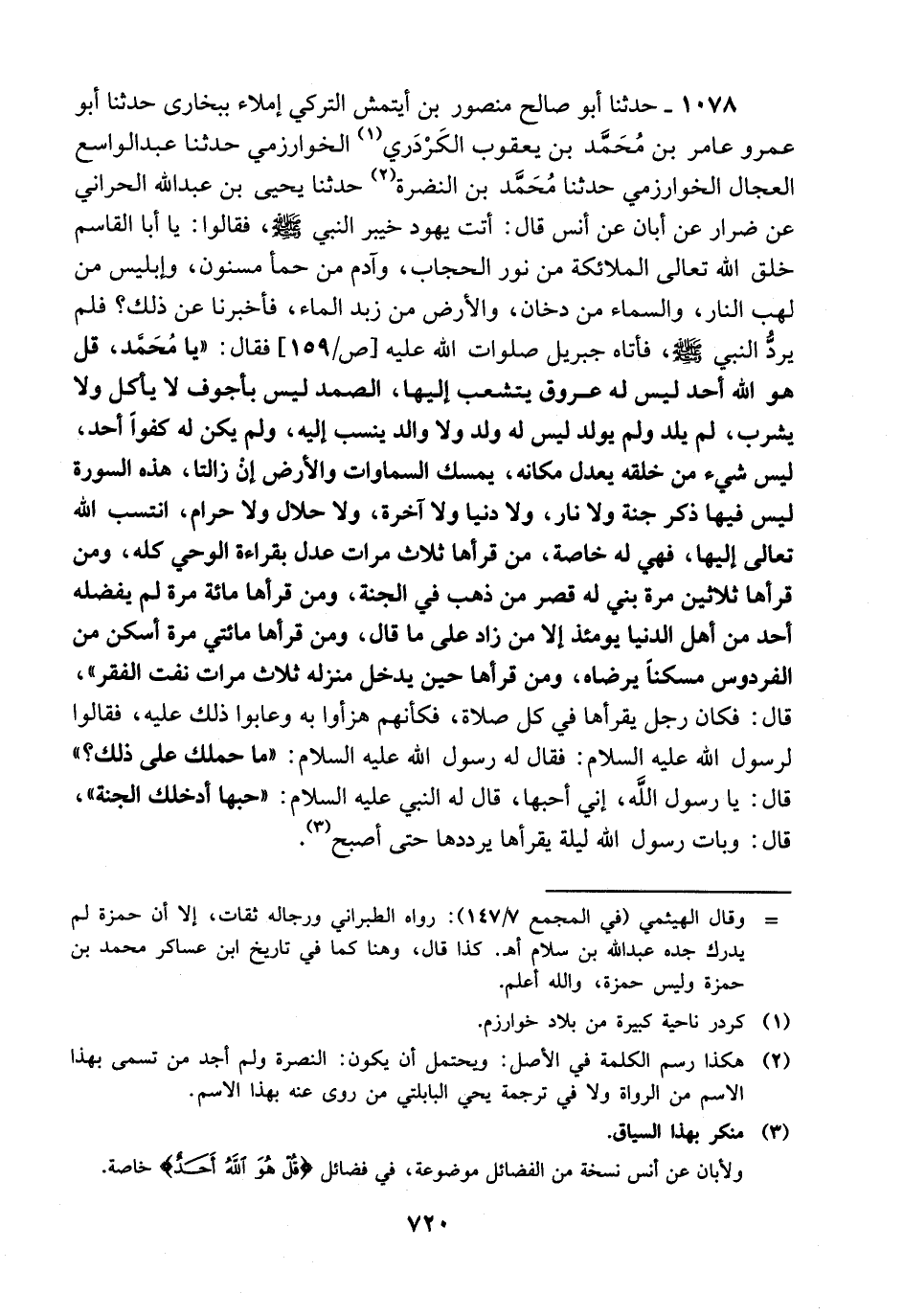 1078- حدثنا أبو صالح منصور بن أيتمش التركي إملاء ببخاري حدثنا أبو عمرو عامر بن محمد بن يعقوب الكردري الخوارزمي حدثنا عبد الواسع العجال الخوارزمي حدثنا محمد بن النضرة حدثنا يحيى بن عبد الله الحراني عن ضرار عن أبان عن أنس قال: أتت يهود خيبر النبي صلى الله عليه وسلم فقالوا: ياأبا القاسم خلق الله تعالى الملائكة من نور الحجاب وآدم من حمأ مسنون وإبليس من لهب النار والسماء من دخان والأرض من زبد الماء فأخبرنا عن ذلك؟ فلم يرد النبي صلى الله عليه وسلم فأتاه جبريل صلوات الله عليه فقال: يامحمد قل هو الله أحد ليس له عروق يتشعب إليها الصمد ليس بأجوف لا يأكل، ولاَ يشرب لم يلد ولم يولد ليس له ولد، ولاَ والد ينسب إليه ولم يكن له كفوا أحد ليس شيء من خلقه يعدل مكانه يمسك السماوات والأرض إن زالتا هذه السورة ليس فيها ذكر جنة، ولاَ نار، ولاَ دنيا، ولاَ آخرة، ولاَ حلال، ولاَ حرام انتسب الله تعالى إليها فهي له خاصة من قرأها ثلاث مرات عدل بقراءة الوحي كله، وَمن قرأها ثلاثين مرة بني له قصر من ذهب في الجنة، وَمن قرأها مائة مرة لم يفضله أحد من أهل الدنيا يومئذ إلا من زاد على ما قال، وَمن قرأها مائتي مرة أسكن من الفردوس مسكنا يرضاه، وَمن قرأها حين يدخل منزله ثلاث مرات نفت الفقر قال: فكان رجل يقرأها في كل صلاة فكأنهم هزأوا به وعابوا ذلك عليه فقالوا لرسول الله عليه السلام: فقال له رسول الله عليه السلام: ما حملك على ذلك؟ قال: يا رسول الله إني أحبها قال له النبي عليه السلام: حبها أدخلك الجنة قال: وبات رسول الله ليلة يقرأها يرددها حتى أصبح.