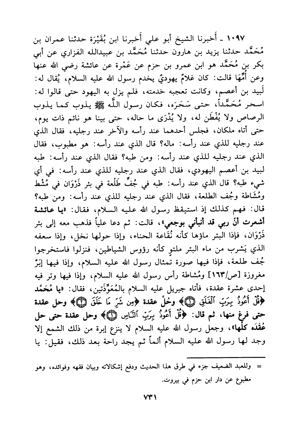1097- أخبرنا الشيخ أبو علي أخبرنا ابن بقيرة حدثنا عمران بن محمد حدثنا يزيد بن هارون حدثنا محمد بن عبيد الله الفزاري، عَن أبي بكر بن محمد هو ابن عمرو بن حزم عن عمرة عن عائشة رضي الله عنها وعن أمها قالت: كان غلام يهودي يخدم رسول الله عليه السلام يقال له: لبيد بن أعصم وكانت تعجبه خدمته فلم يزل به اليهود حتى قالوا له: اسحر محمدا حتى سحره فكان رسول الله صلى الله عليه وسلم يذوب كما يذوب الرصاص، ولاَ يفطن له، ولاَ يدرى ما حاله حتى بينا هو نائم ذات يوم حتى أتاه ملكان فجلس أحدهما عند رأسه والآخر عند رجليه فقال الذي عند رجليه للذي عند رأسه: ماله؟ قال الذي عند رأسه: هو مطبوب فقال الذي عند رجليه للذي عند رأسه:، وَمن طبه؟ فقال الذي عند رأسه: طبه لبيد بن أعصم اليهودي، فقال الذي عند رجليه للذي عند رأسه: في أي شيء طبه؟ قال الذي عند رأسه: طبه في جف طلعة في بئر ذروان في مشط ومشاطة وجف الطلعة فقال الذي عند رجليه للذي عند رأسه:، وَمن طبه؟ قال: فهم كذلك إذ استيقظ رسول الله عليه السلام فقال: ياعائشة أشعرت أن ربي قد أنبأني بوجعي قالت: ثم دعا عليا فذهب معه إلى بئر ذروان فإذا البئر ماؤها كأنه نقاعة الحناء وإذا حولها نخل وإذا سعفه الذي يشرب من ماء البئر ملتو كأنه رؤوس الشياطين فنزلوا فاستخرجوا جف طلعة فإذا فيها صورة تمثال رسول الله عليه السلام وإذا فيها إبر مغروزة ومشاطة رأس رسول الله عليه السلام وإذا فيها وتر فيه إحدى عشرة عقدة فأتاه جبريل عليه السلام بالمعوذتين فقال: يامحمد {قل أعوذ برب الفلق} وحل عقدة {من شر ما خلق} وحل عقدة حتى فرغ منها ثم قال {قل أعوذ برب الناس} وحل عقدة حتى حل عقدة كلها وجعل رسول الله عليه السلام لا ينزع إبرة من ذلك الشمع إلا وجد لها رسول الله عليه السلام ألما ثم يجد راحة بعد ذلك فقيل: يا -[732]- رسول الله لو قتلت اليهودي قال: لا إن الله عز وجل قد عافاني وما وراءه من عذاب أكبر قالت: فأخرجه.