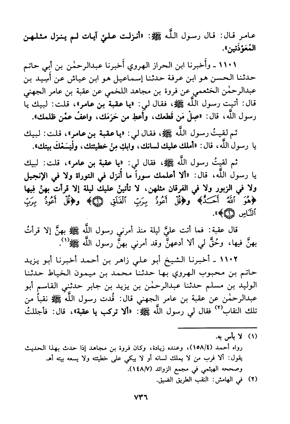 1101- وأخبرنا ابن الحراز الهروي أخبرنا عبد الرحمن بن أبي حاتم حدثنا الحسن هو ابن عرفة حدثنا إسماعيل هو ابن عياش عن أسيد بن عبد الرحمن الخثعمي عن فروة بن مجاهد اللخمي عن عقبة بن عامر الجهني قال: أتيت رسول الله صلى الله عليه وسلم فقال لي: ياعقبة بن عامر قلت: لبيك يا رسول الله قال: صل من قطعك وأعط من حرمك واعف عمن ظلمك، ثم لقيت رسول الله صلى الله عليه وسلم فقال لي: ياعقبة بن عامر قلت: لبيك يا رسول الله قال: أملك عليك لسانك وابك من خطيئتك وليسعك بيتك، ثم لقيت رسول الله صلى الله عليه وسلم فقال لي: ياعقبة بن عامر قلت: لبيك يا رسول الله قال: ألا أعلمك سورا ما أنزل في التوراة، ولاَ في الإنجيل، ولاَ في الزبور، ولاَ في الفرقان مثلهن لا تأتين عليك ليلة إلا قرأت بهن فيها {هو الله أحد} و {قل أعوذ برب الفلق} و {قل أعوذ برب الناس} .