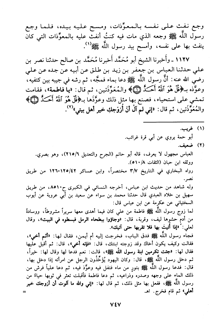 1127- وأخبرنا الشيخ أبو محمد أخبرنا محمد بن صالح حدثنا نصر بن علي حدثنا العباس بن جعفر بن زيد بن طلق عن أبيه عن جده عن علي رضي الله عنه: أن رسول الله صلى الله عليه وسلم دعا بماء فمجه ثم رشه في جيبه بين كتفيه وعوذه بـ {قل هو الله أحد} والمعوذتين ثم قال: يافاطمة فقامت تمشي على استحياء فصنع بها مثل ذلك وعوذها بـ {قل هو الله أحد} والمعوذتين ثم قال: إني لم آل أن أزوجك خير أهل بيتي.