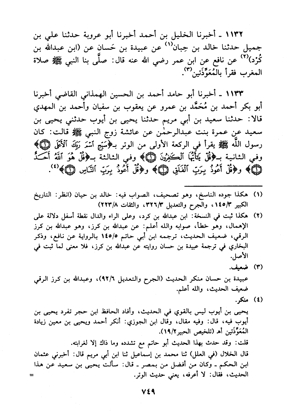 1132- أخبرنا الخليل بن أحمد أخبرنا أبو عروبة حدثنا علي بن جميل حدثنا خالد بن حبان عن عبيدة بن حسان عن ابن عبد الله بن كرد عن نافع عن ابن عمر رضي الله عنه قال: صلى بنا النبي صلى الله عليه وسلم صلاة المغرب فقرأ بالمعوذتين.