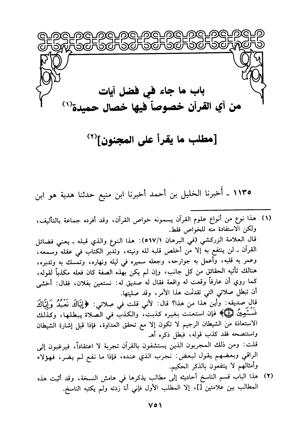 1135- أخبرنا الخليل بن أحمد أخبرنا ابن منيع حدثنا هدبة هو ابن -[752]- خالد حدثنا حماد بن سلمة عن عاصم، عَن أبي وائل عن ابن مسعود قال: من قرأ أربع آيات من أول سورة البقرة وآية الكرسي وآيتين بعد آية الكرسي وثلاث آيات من آخر سورة البقرة لم يقربه يومئذ شيطان، ولاَ يقرأ على مجنون إلا أفاق.